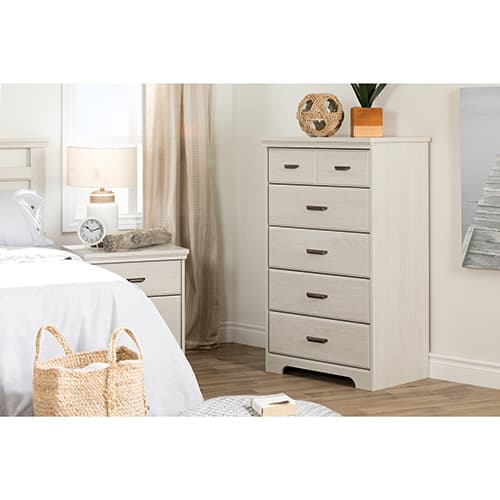 Description This South Shore Versa 5 drawer chest has a traditional style with many storage spaces. The top drawers are separated by a decorative groove that creates the illusion...