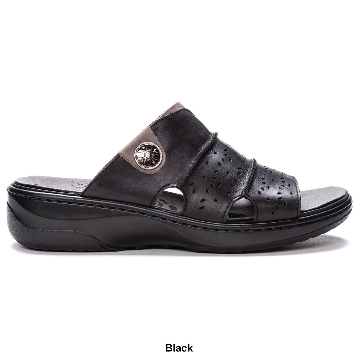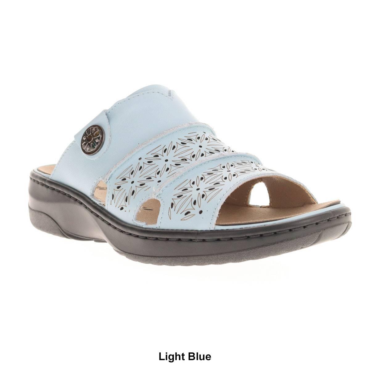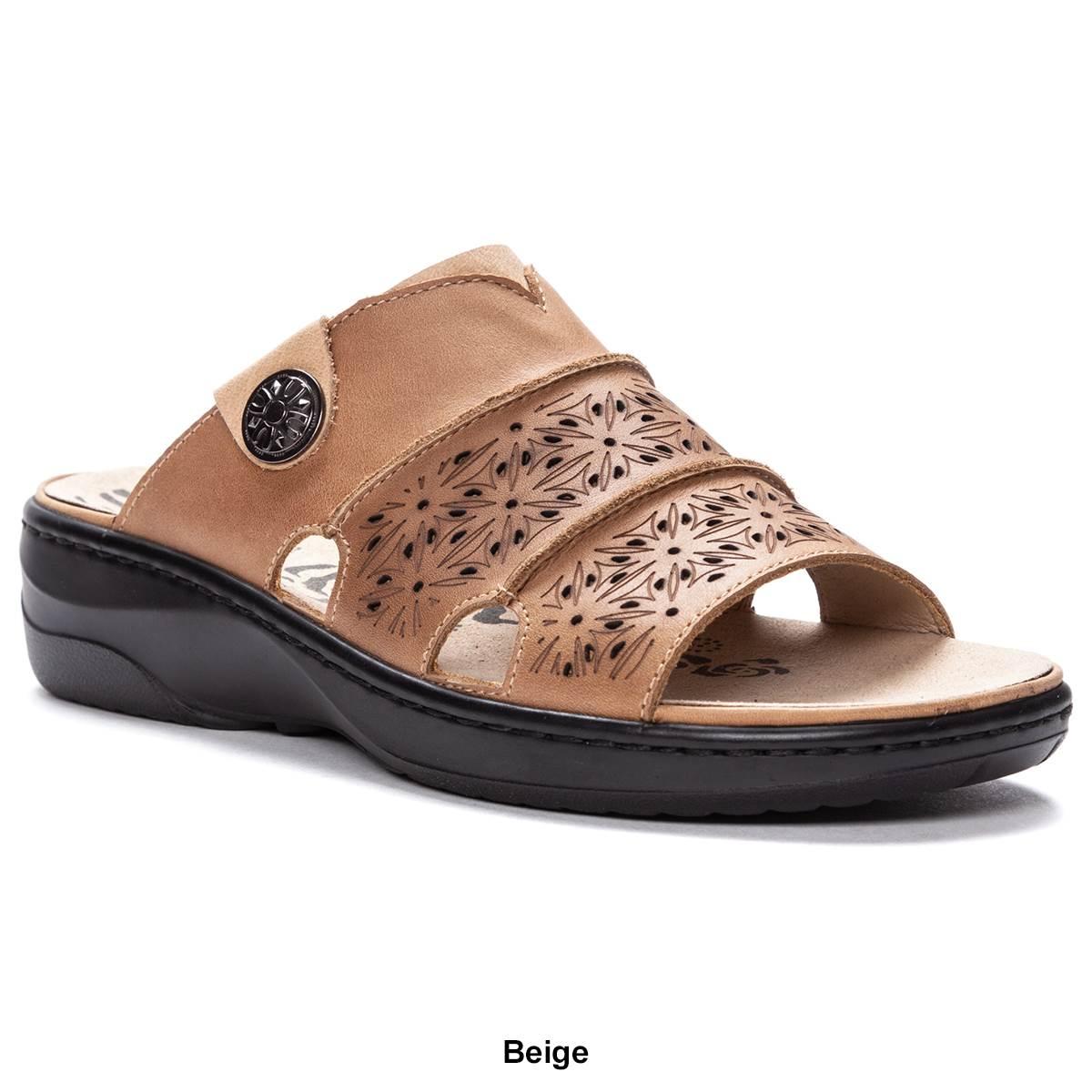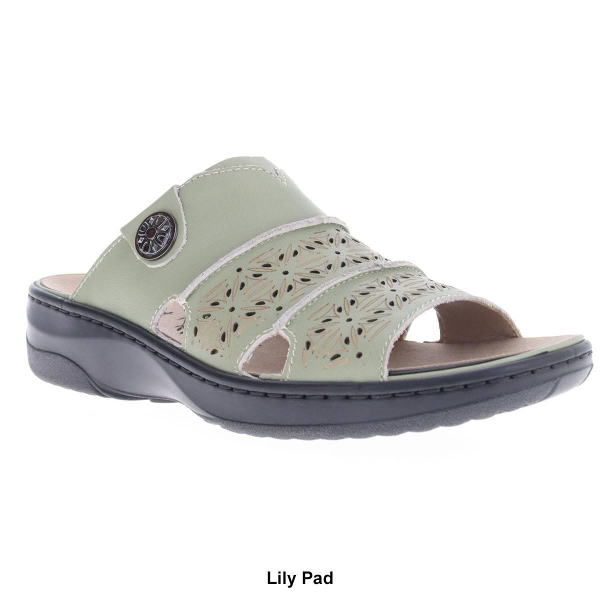 Description Ease into comfortable style with these Womens Propèt® Gertie slide sandals. They have a leather upper and a rubber outsole. The slides feature a laser-cut vamp with...