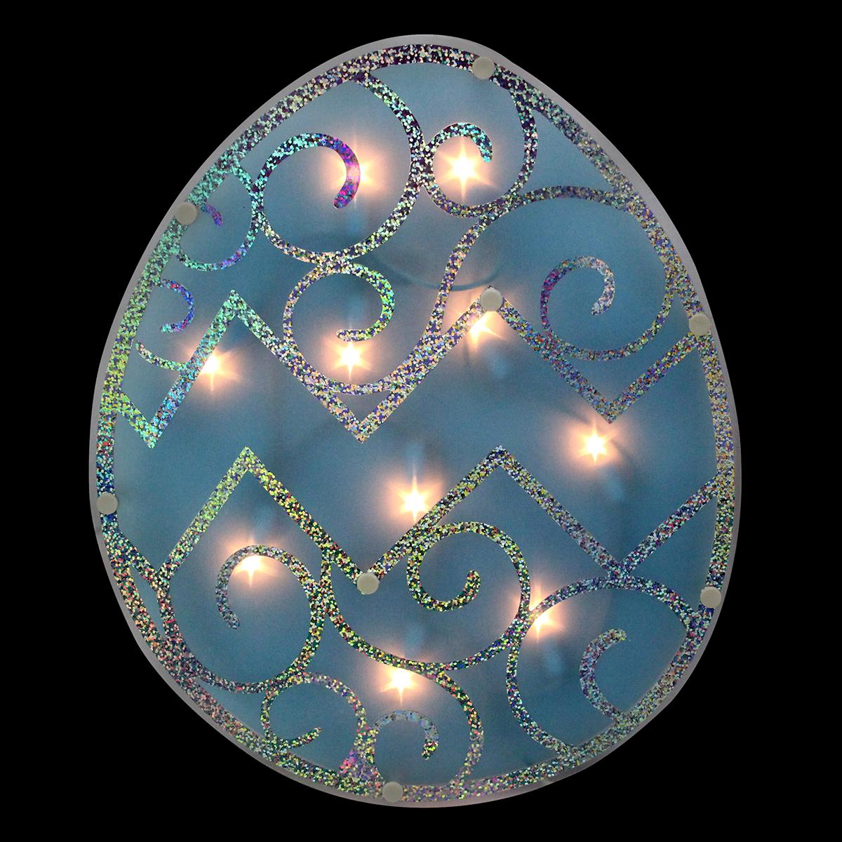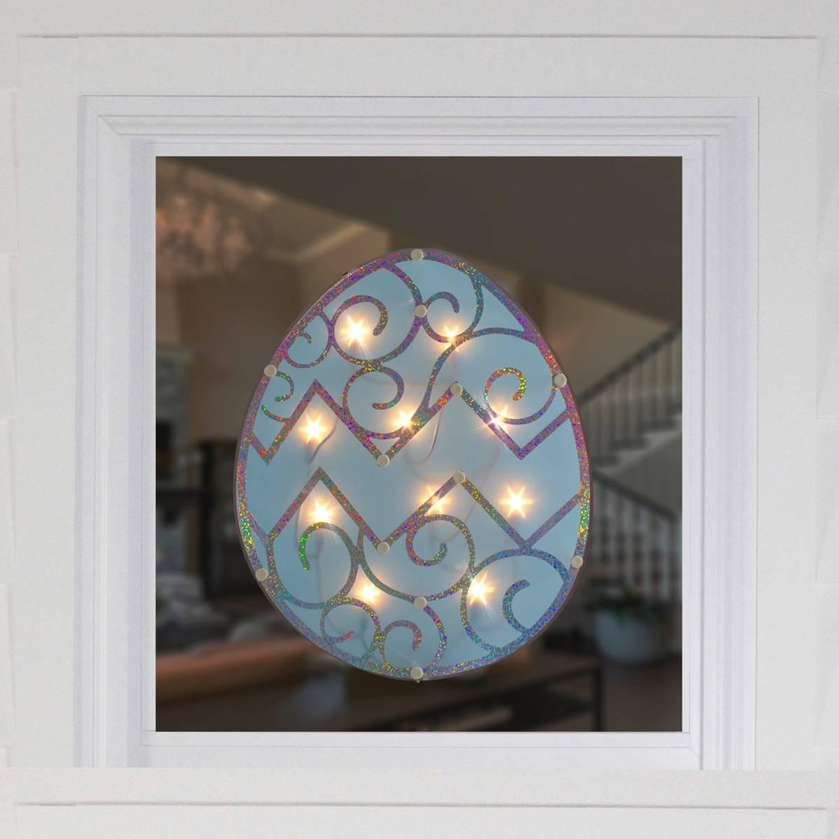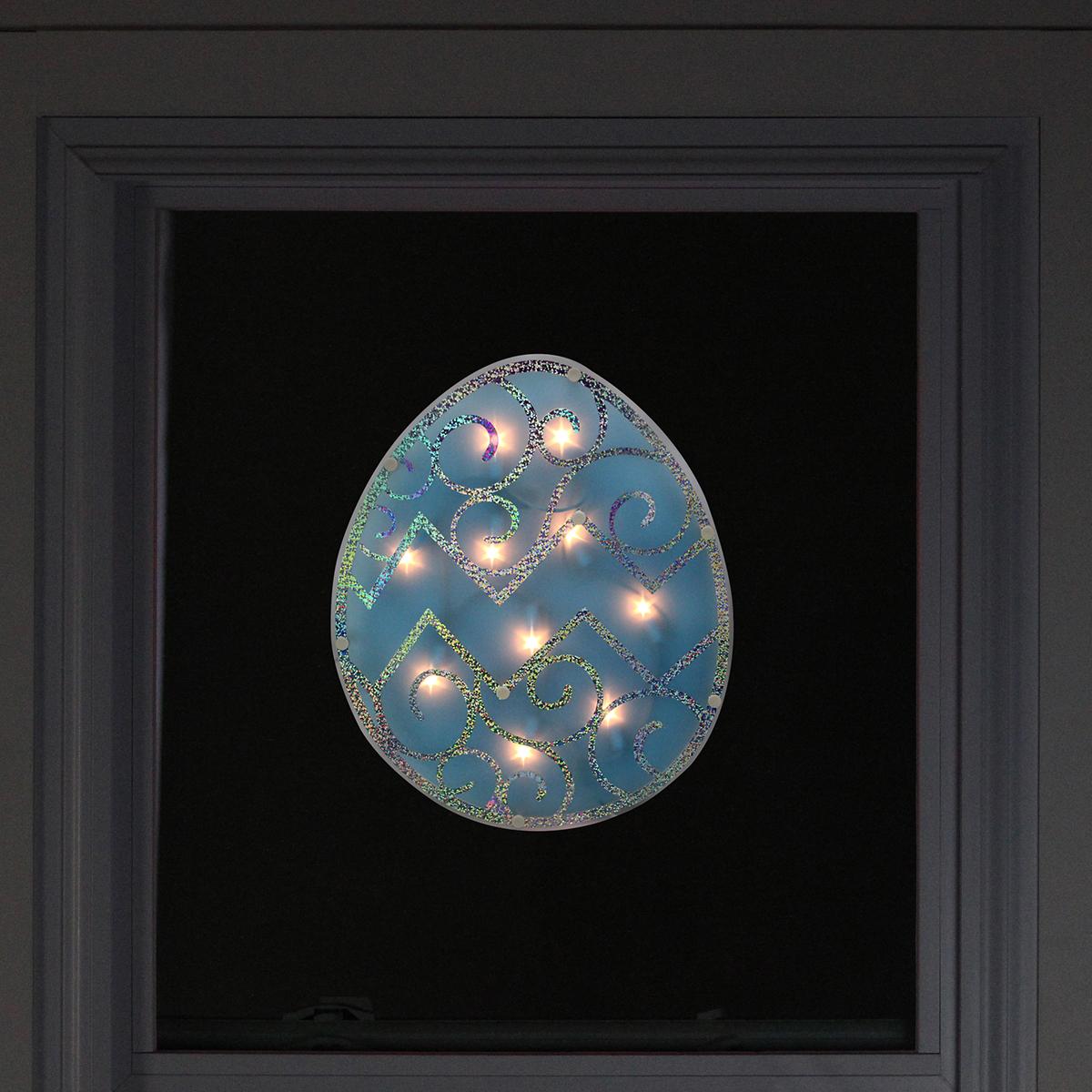 Fill your home with a splash of style and color with this shimmery Northlight Seasonal blue Easter egg window silhouette decoration. Perfect to place in any window in your home or to add to your already existing outdoor Easter decor. The lights are UL listed for indoor or outdoor use and if one bulb burns out the rest will stay lit. This window silhouette comes with one suction cup, replacement bulbs, a spare fuse, and one plug with an end connector allowing you to stack multiple lighted items together, not to exceed 210 watts.