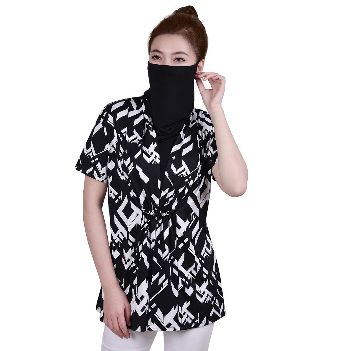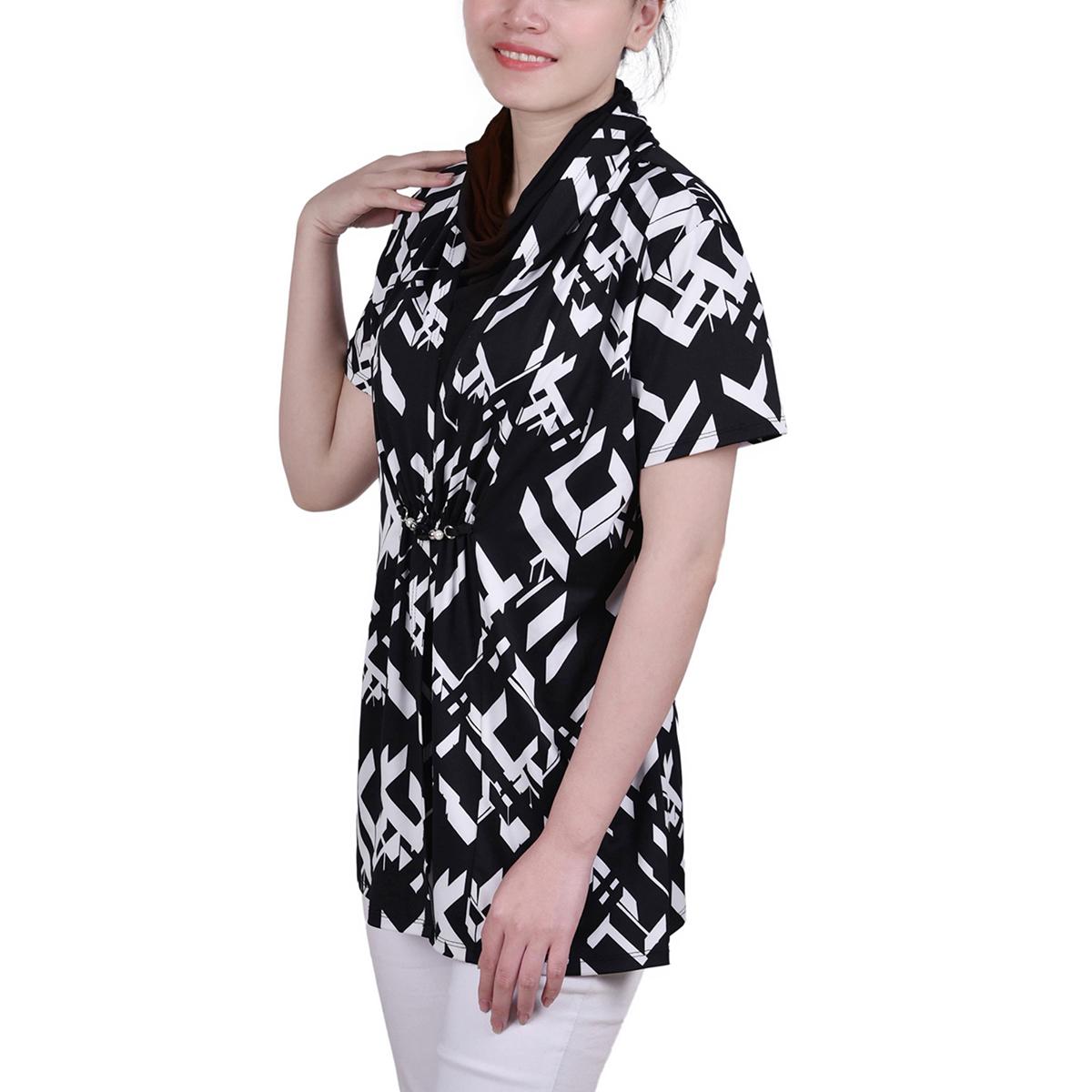 Description This two-in-one style fit and flare tunic from NY Collection comes in a vibrant print and has a neckline button detail, finished with an attached mask. Care: Machine...