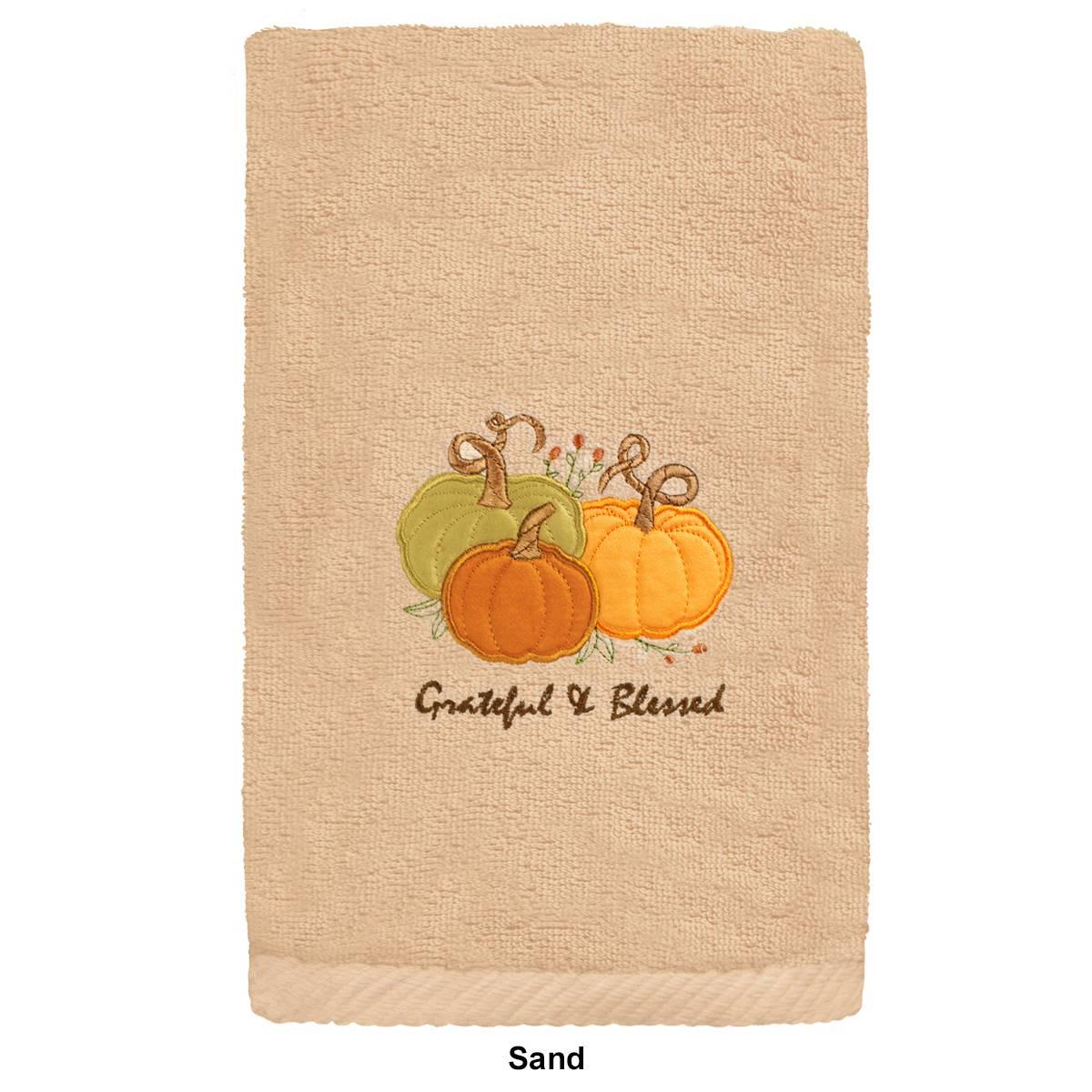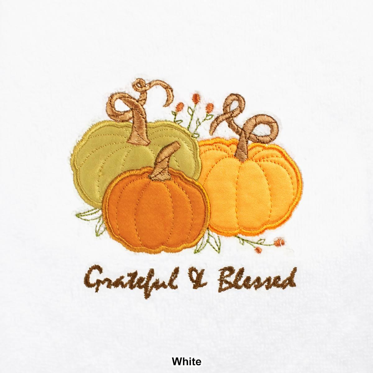 Your autumn decorations are not complete without these Linum Home Textiles inspirational embroidered hand towels for your guest bath. “Grateful & Blessed” hand towels feature bright and lustrous pumpkins appliques and holiday sentiments. These special and luxurious terry hand towels are manufactured with the finest Turkish cotton fiber for maximum softness and absorbency.