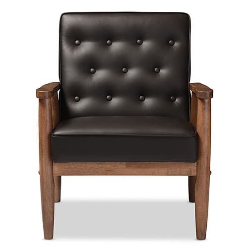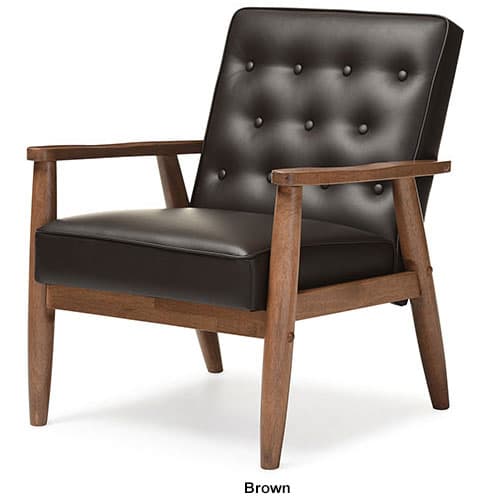 This Baxton Studio Sorrento mid-century modern lounge chair has a simple, post-modern design that works well with a variety of styles. The chair is upholstered in faux leather with solid rubberwood legs and frame. The sculptural arms and the wide, welcoming seat are a throwback to classic 1950s and 60s Danish design. A fully upholstered seat with exposed dark walnut wood looks great from all angles, whether in a lounge arrangement, public waiting area or private office. The splayed legs and button-tufting design add a retro modern touch to this piece of clean lines furniture. Wipe with a damp cloth, either with or without a small amount of mild soap (test first), then wipe dry. Dimensions: 33”H x 27.1”W x 29.5”D.