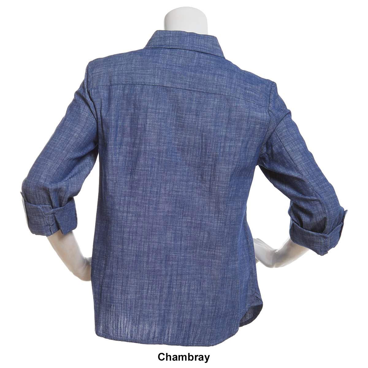 Be comfortable and stylish in this Womens Tommy Hilfiger casual button down. This solid top has 3/4 roll tab sleeves, a spread collar, and a round hem.