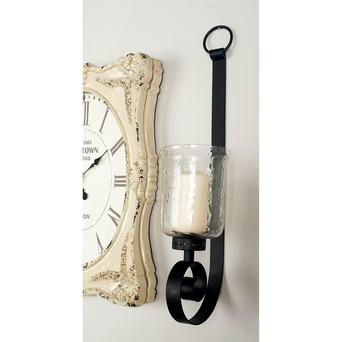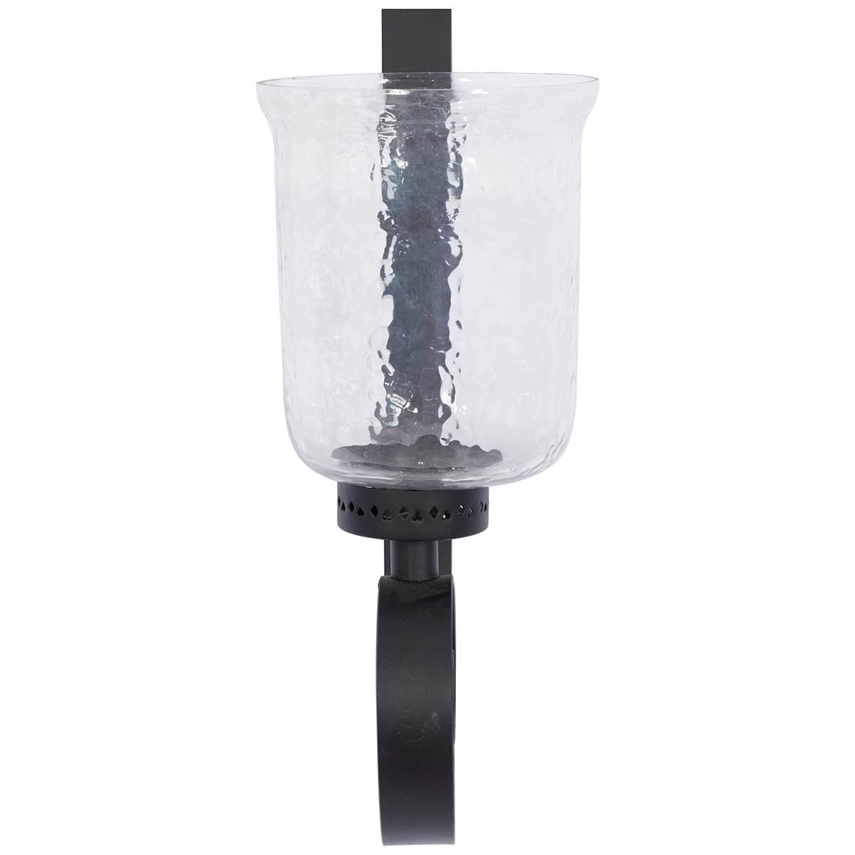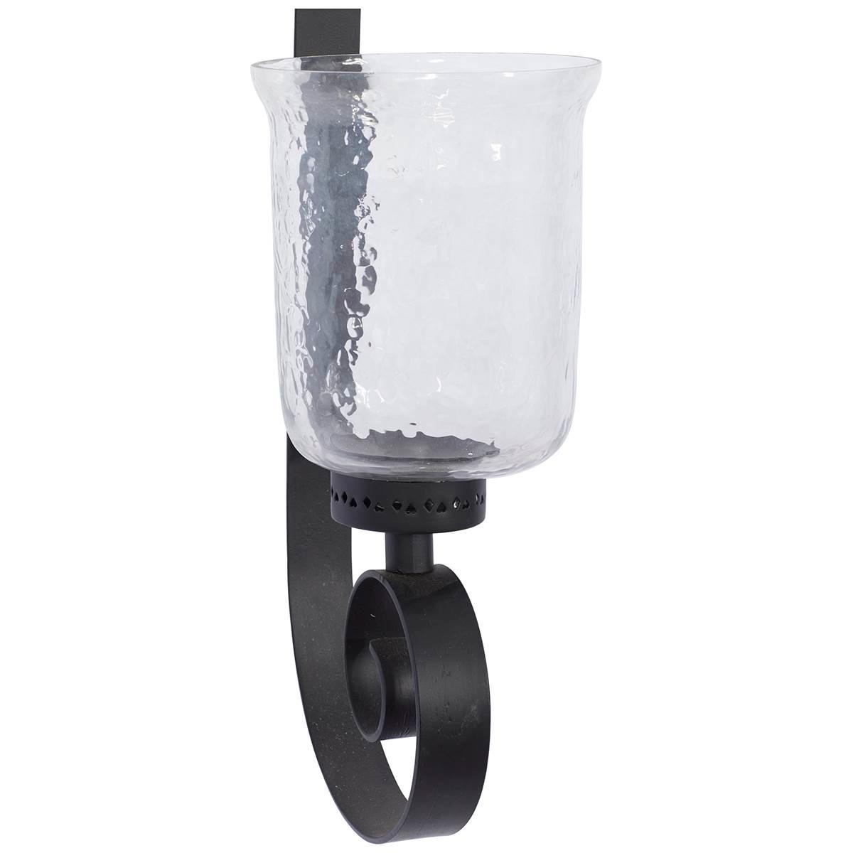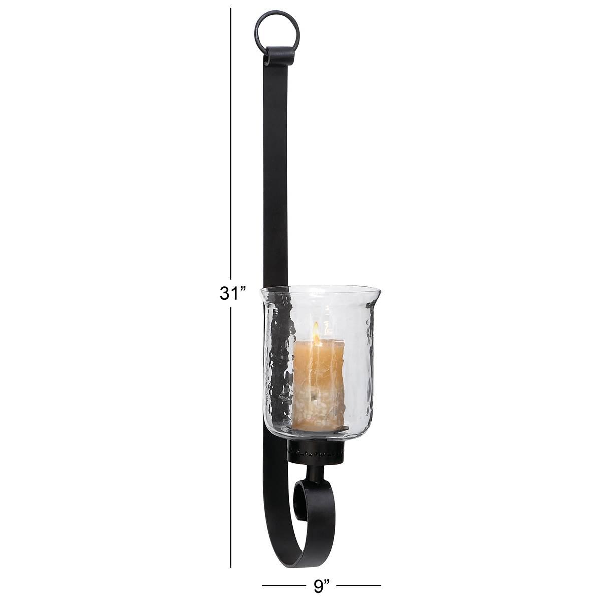 Impress guests with this 9th & Pike® wall sconce light fixture. The sconce has an elongated, open design composed of wrought iron and holds a cylindrical glass chamber and metal plate, which are used to secure a candle. Add it to a hallway or position it next to a mirror in your living room or bedroom.