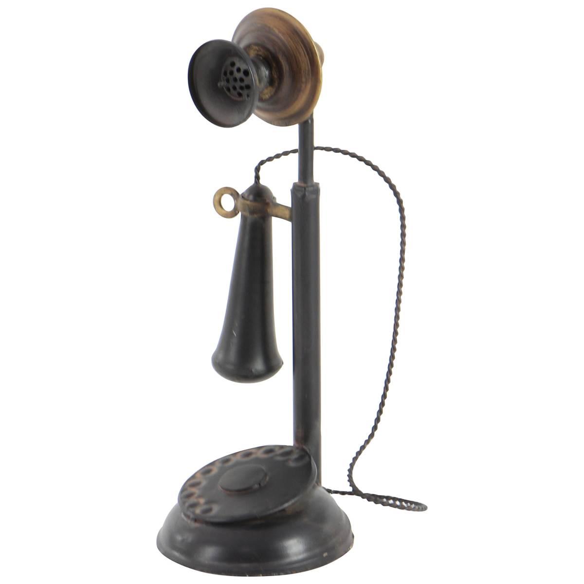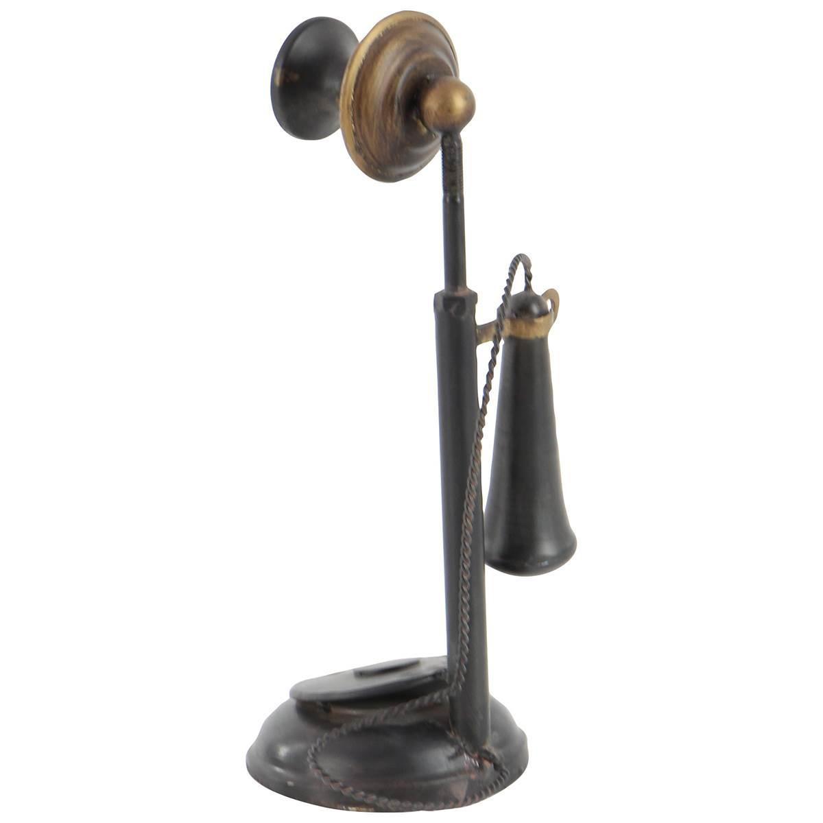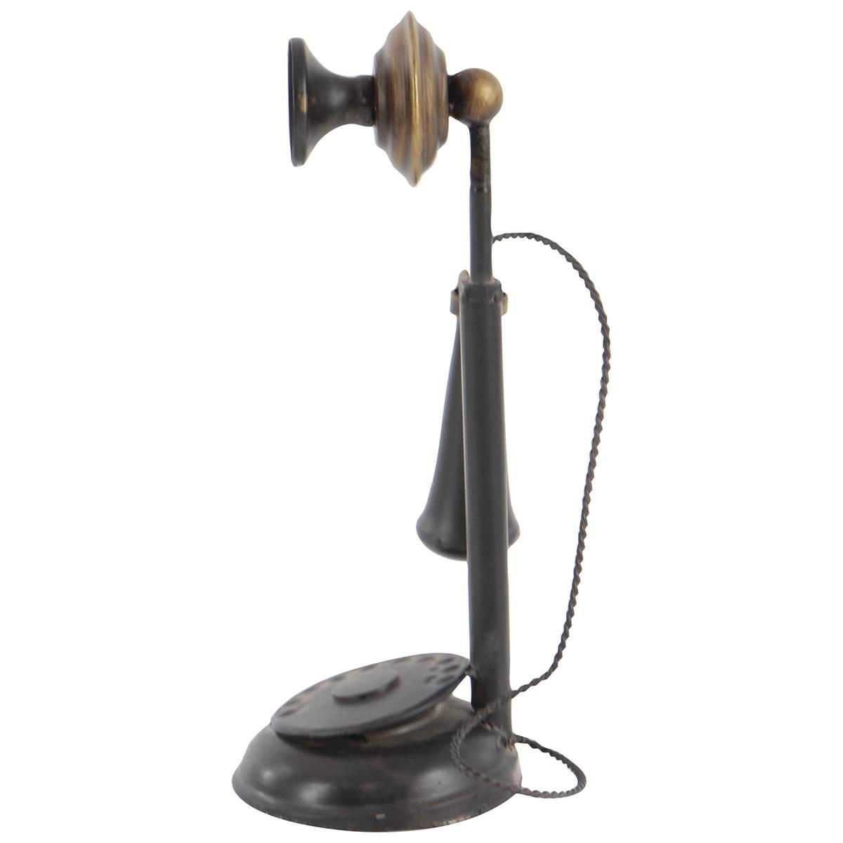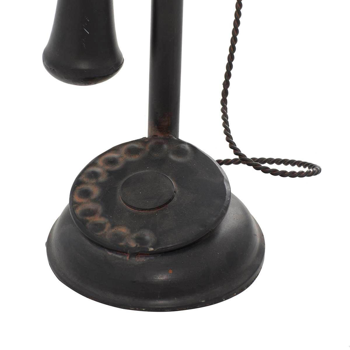 This 9th & Pike® antique style phone decor is modeled after a vintage candlestick phone. The tarnished and distressed black finish of the ear piece, receiver, and raised dial plate adds an authentic look. Decorative rust and brushed gold accentuate the button outlines, braided iron cord. This accent decor looks great on a shelf or desk with other early 20th century collectibles.