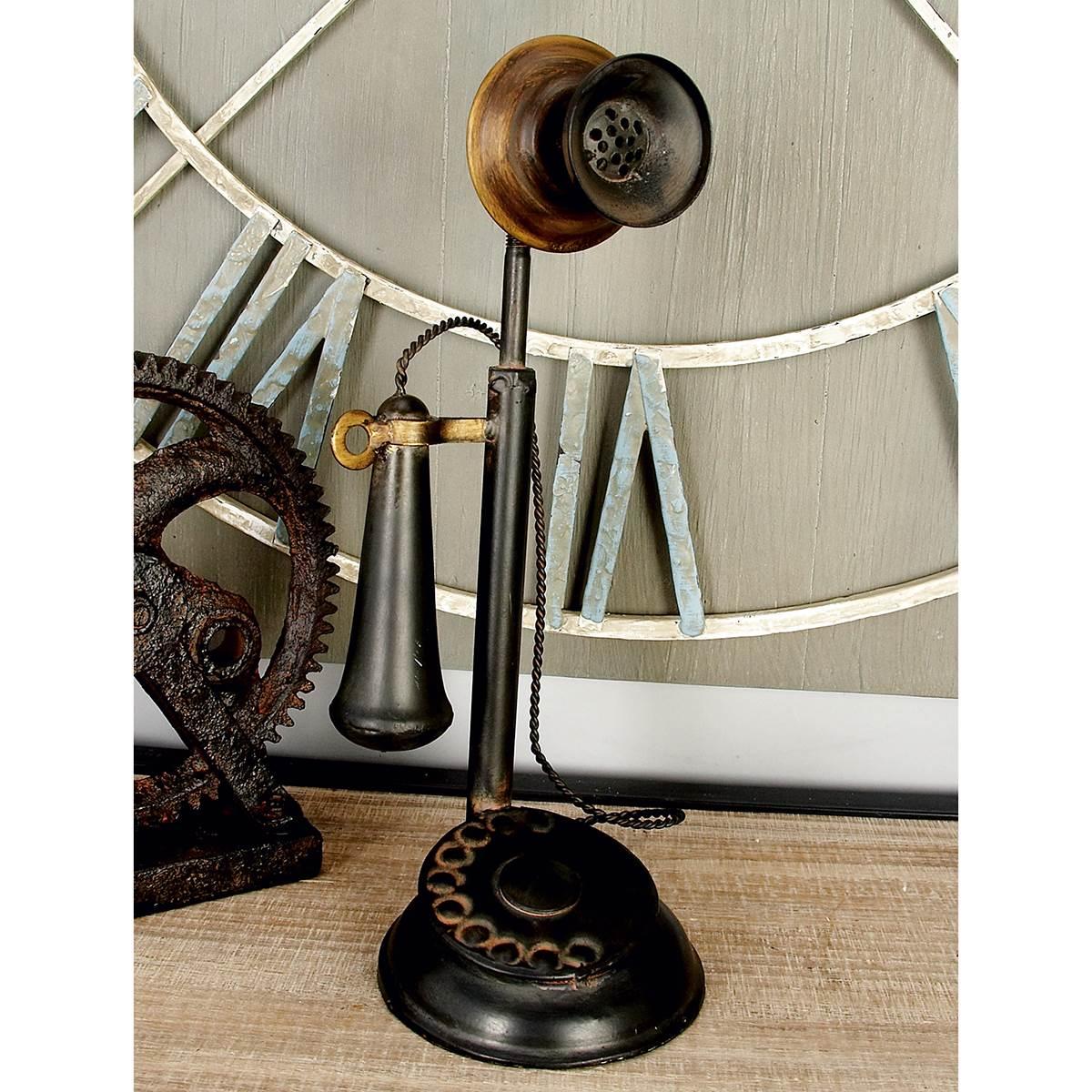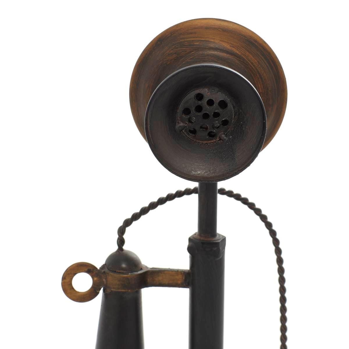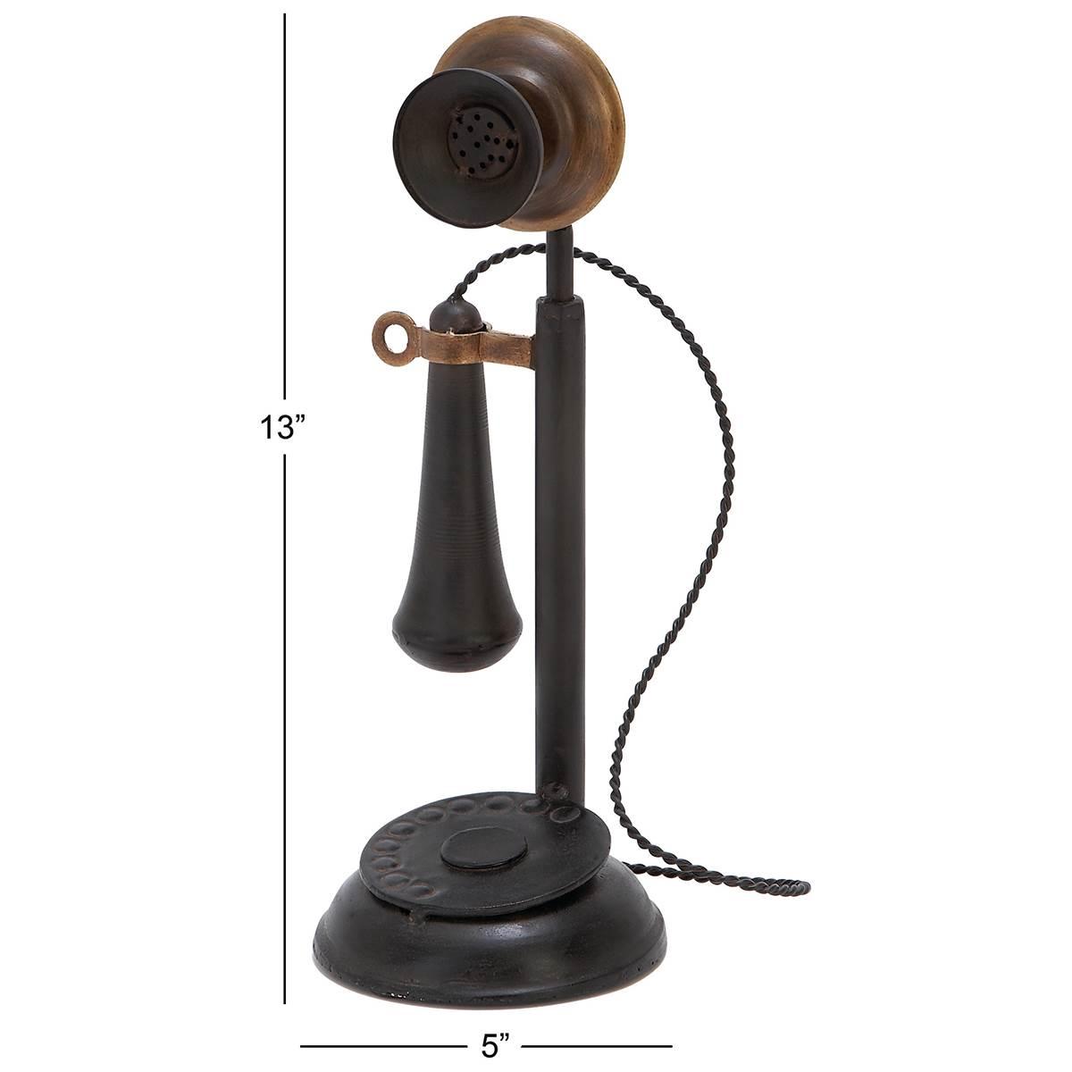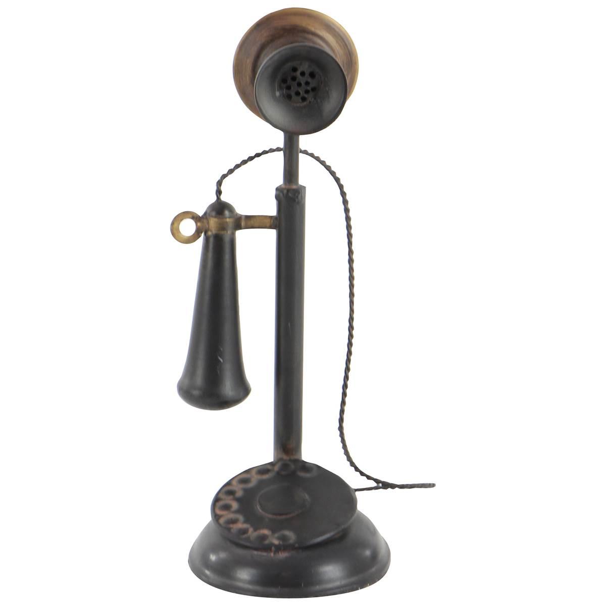 This 9th & Pike® antique style phone decor is modeled after a vintage candlestick phone. The tarnished and distressed black finish of the ear piece, receiver, and raised dial plate adds an authentic look. Decorative rust and brushed gold accentuate the button outlines, braided iron cord. This accent decor looks great on a shelf or desk with other early 20th century collectibles.