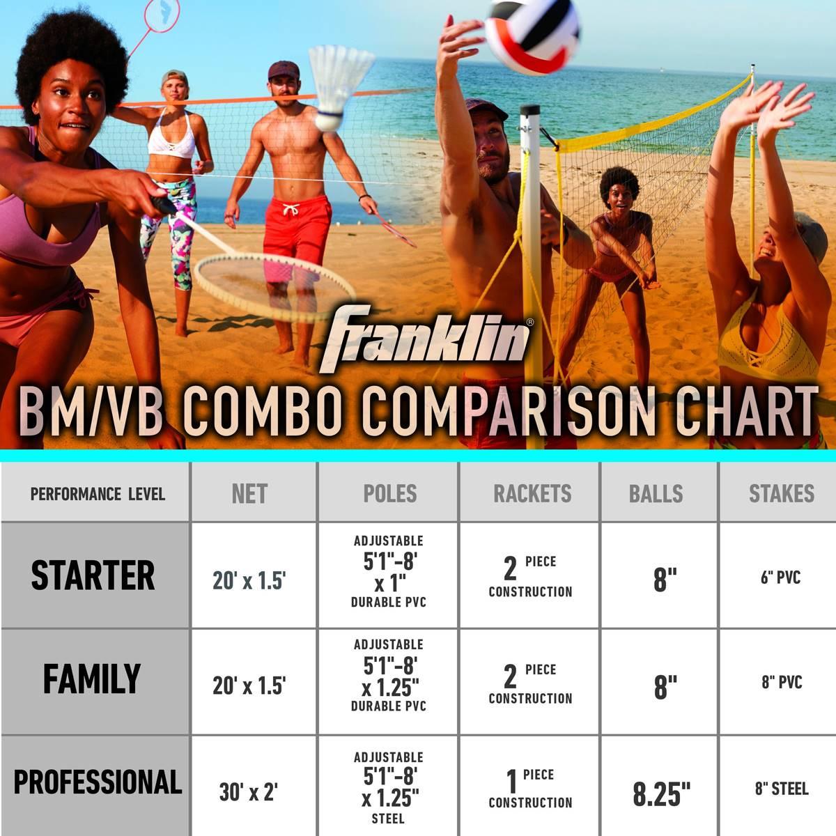 Description Franklin® volleyball/badminton starter set. The set includes all you need for a day of fun: (1) Combo Volleyball/Badminton pole set and net, (4) steel badminton...