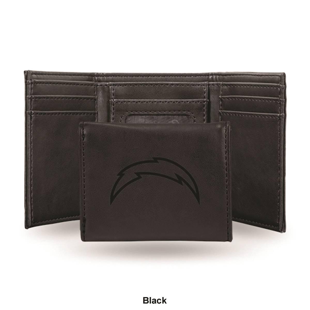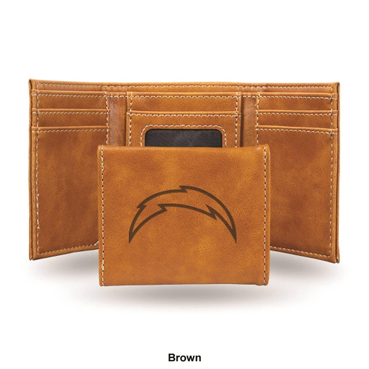 Carry a part of your favorite team with you and simultaneously keep your money safe with this Mens NFL Los Angeles Chargers trifold wallet. Made of faux leather, the 4-inch long and 3.25-inch wide wallet features a Los Angeles Chargers embossed logo, card slots, and an ID window for a complete look.