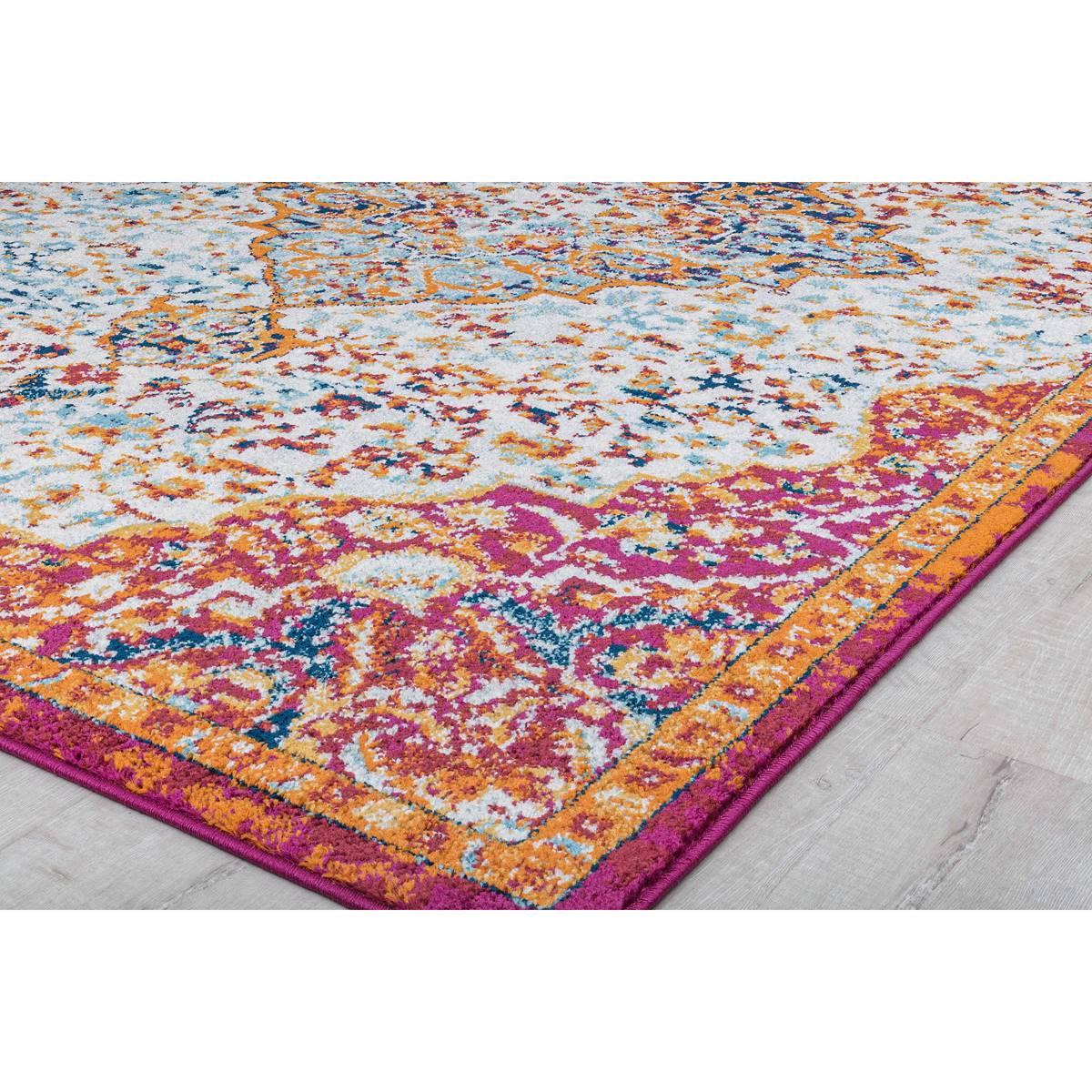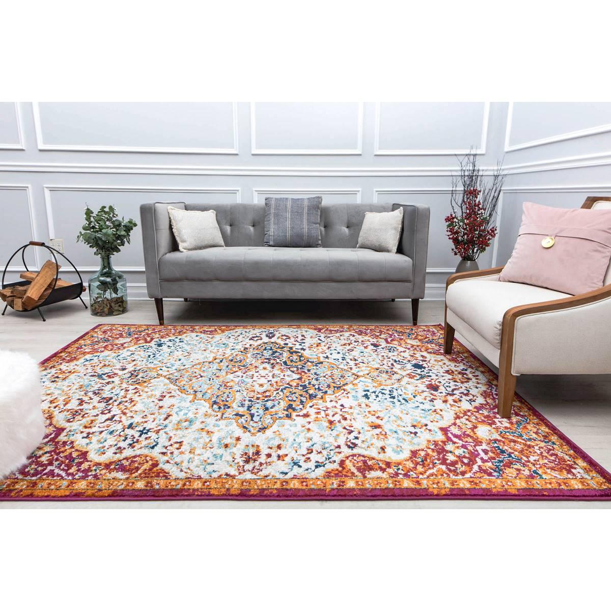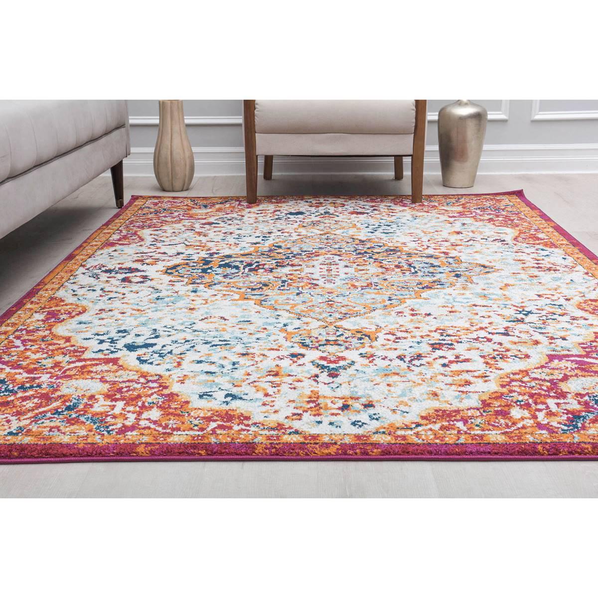 Tie together any room with this Rugs America™ Hailey Amelia Blush Abstract Vintage Area Rug. The rug features the artfully nuanced juxtaposition of a lacy, almost icy, medallion with a striking fiery composition, dotted with magenta, orange, and deep blue. This rug is guaranteed to take center stage in your room. Made in Turkey.