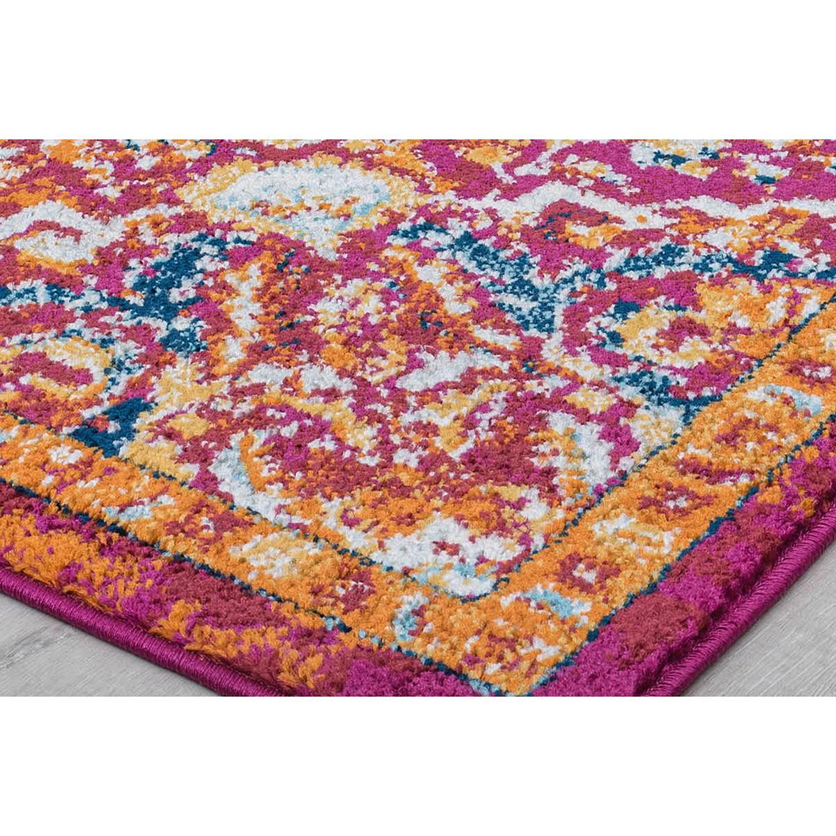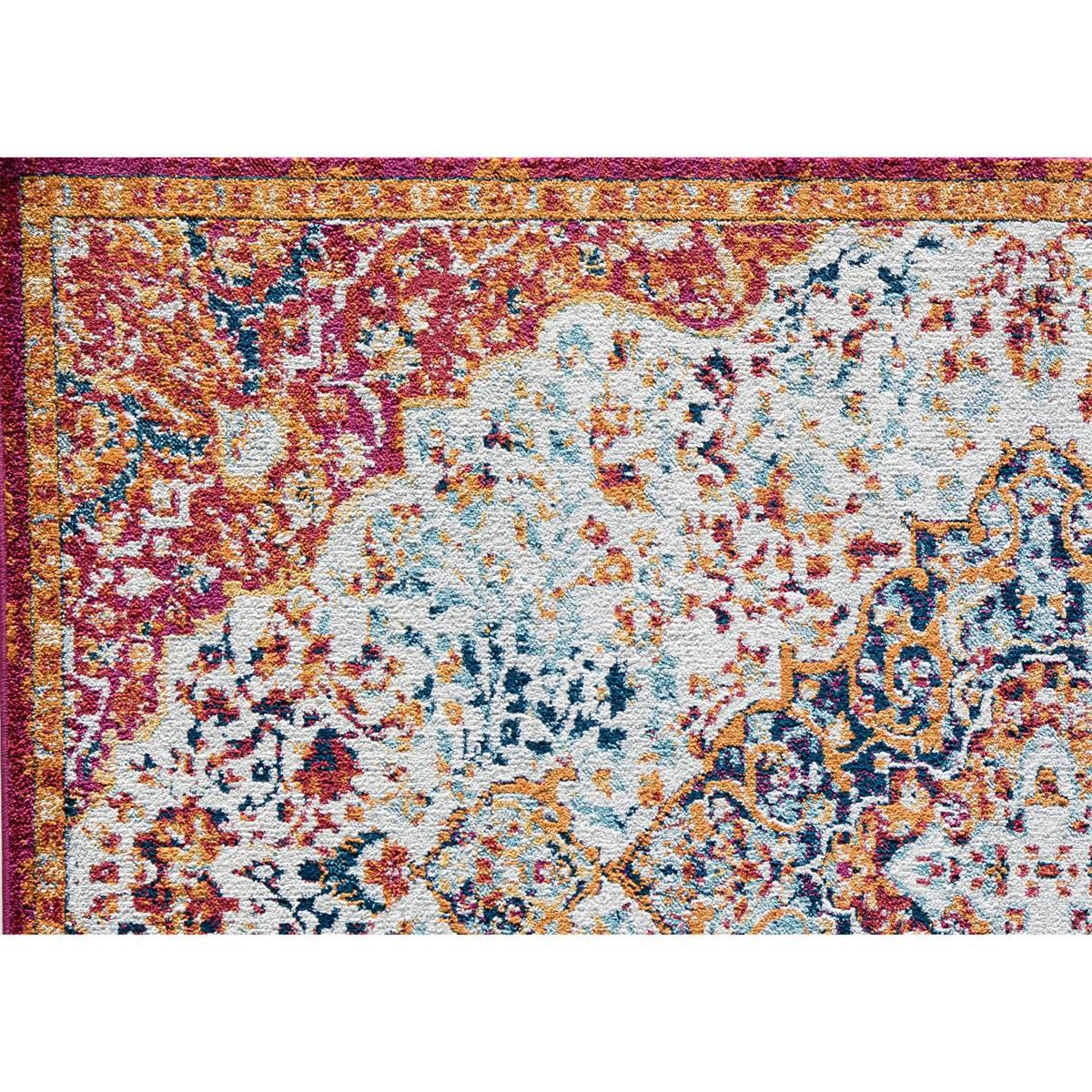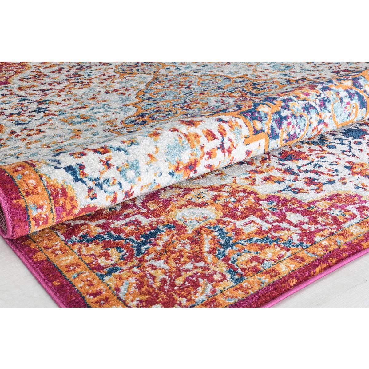 Tie together any room with this Rugs America™ Hailey Amelia Blush Abstract Vintage Area Rug. The rug features the artfully nuanced juxtaposition of a lacy, almost icy, medallion with a striking fiery composition, dotted with magenta, orange, and deep blue. This rug is guaranteed to take center stage in your room. Made in Turkey.