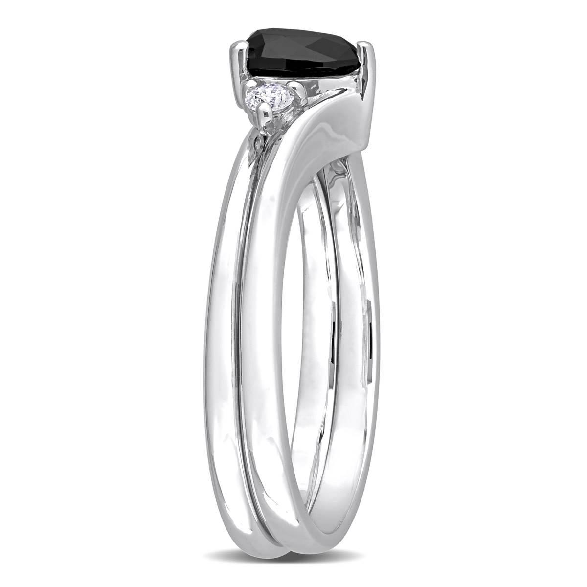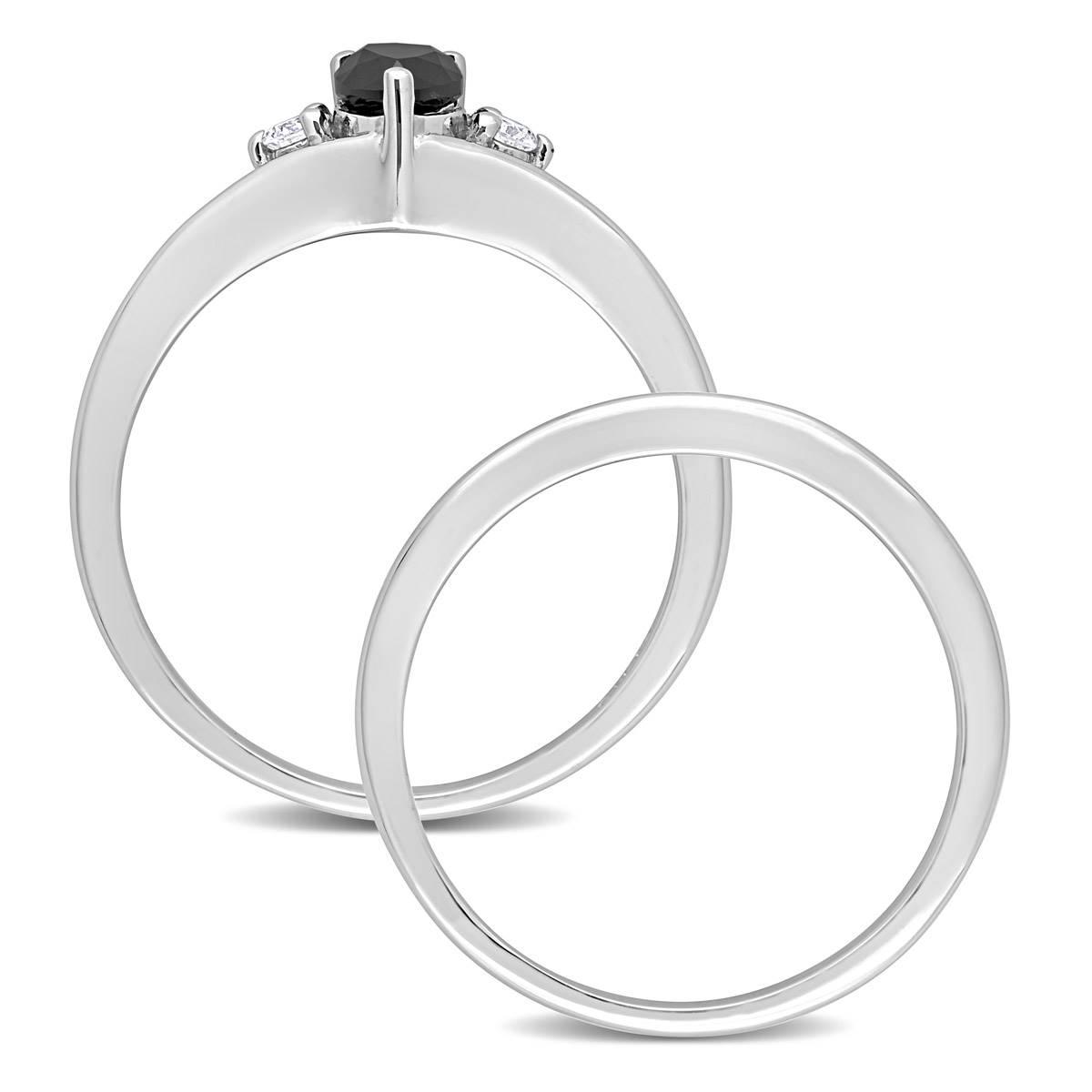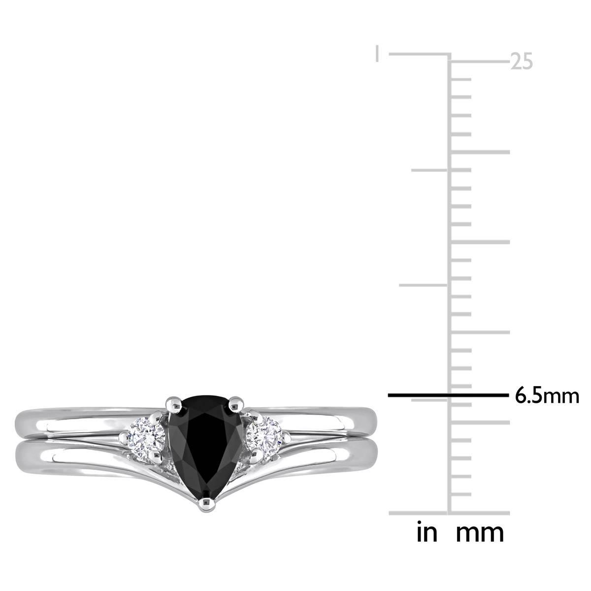 This Radiant Rainbow™ 10kt. white gold 5/8ctw. pear diamond ring is the perfect gift for a loved one. This modern engagement ring features a pear-cut, prong-set black diamond and two round-cut white diamonds in a unique three-stone teardrop bridal design.