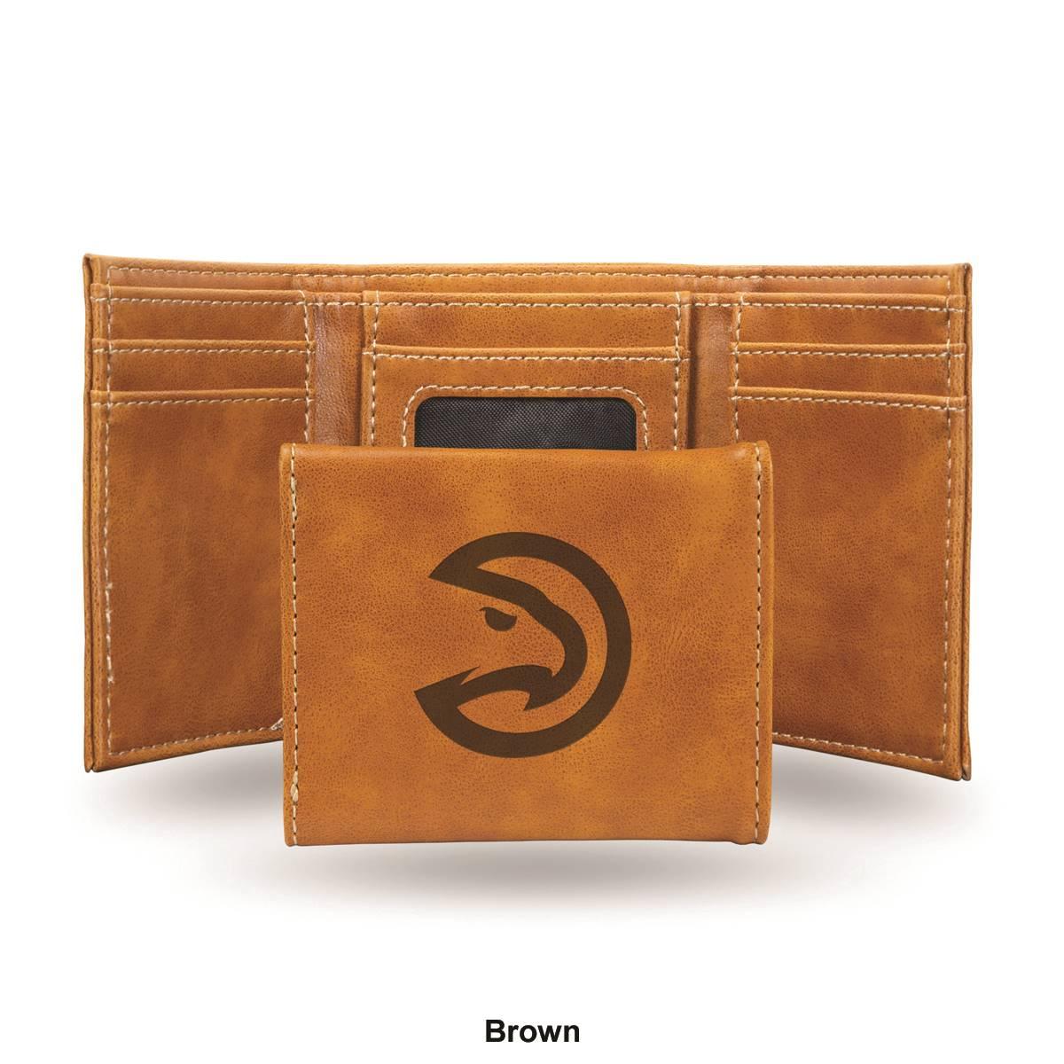 Carry a part of your favorite team with you and simultaneously keep your money safe with this Mens NBA Atlanta Hawks trifold wallet. Made of faux leather, the 4-inch long and 3.25-inch wide wallet features an Atlanta Hawks embossed logo, card slots, and an ID window for a complete look.