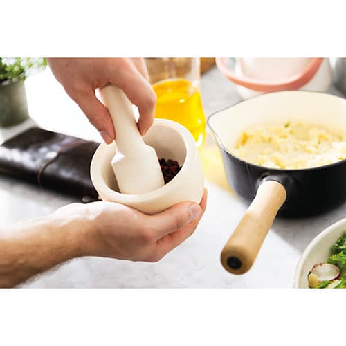 This BergHOFF Leo small mortar and pestle is great for grinding and pounding herbs and spices to make homemade pesto and salsa. This item is suitable to go from the kitchen directly to the table. Hand wash recommended. Dimensions: 3.5”H x 4”W x 4”D.Limited Manufacturer´s Warranty.
