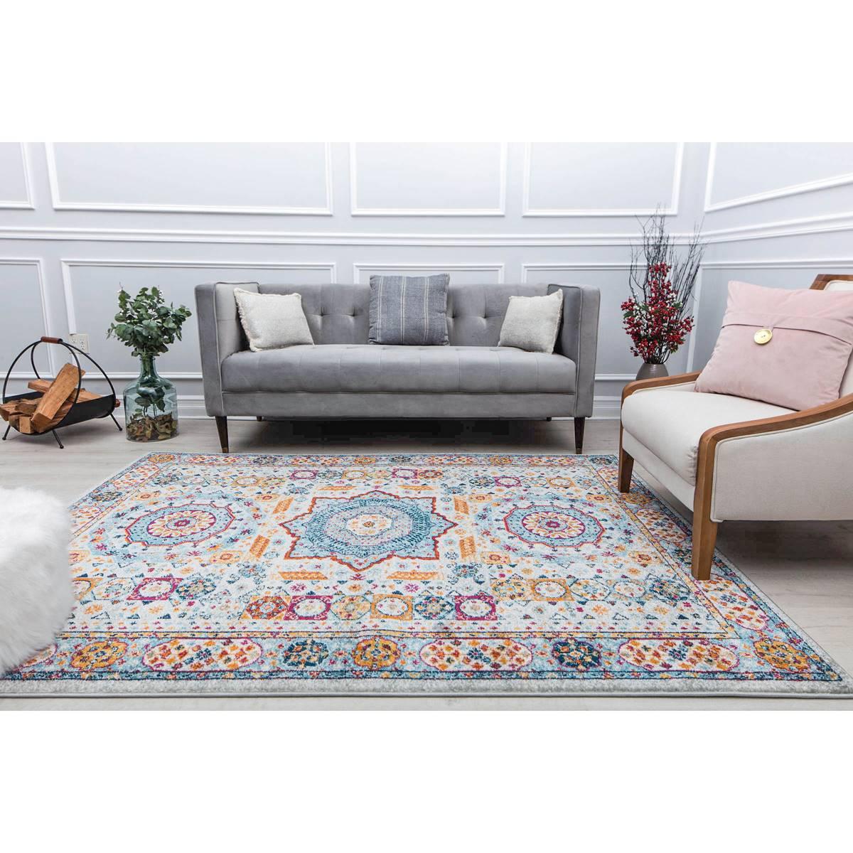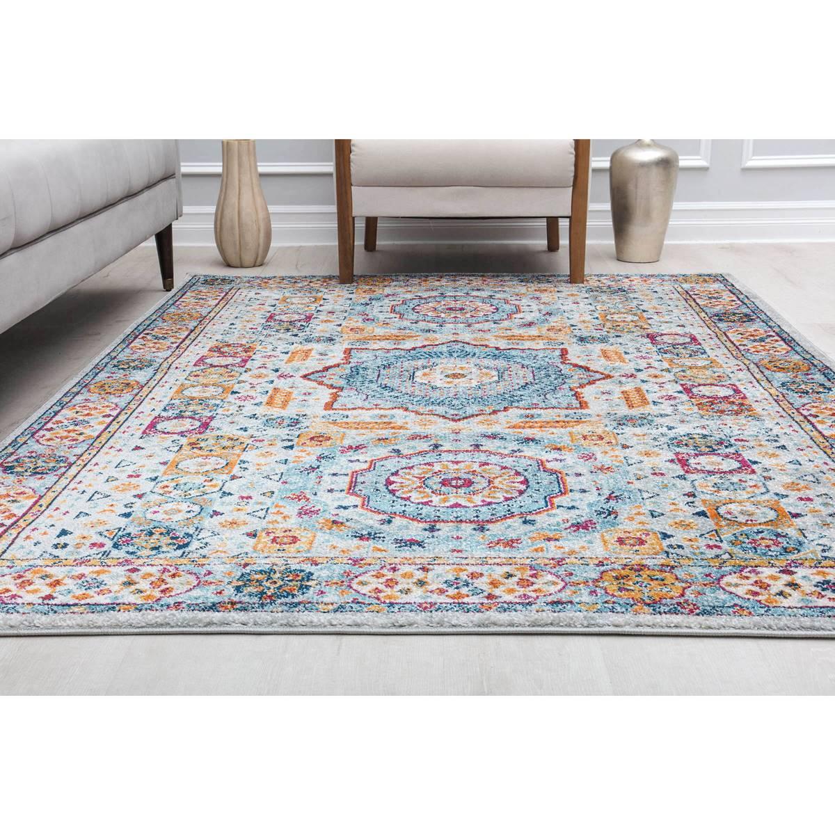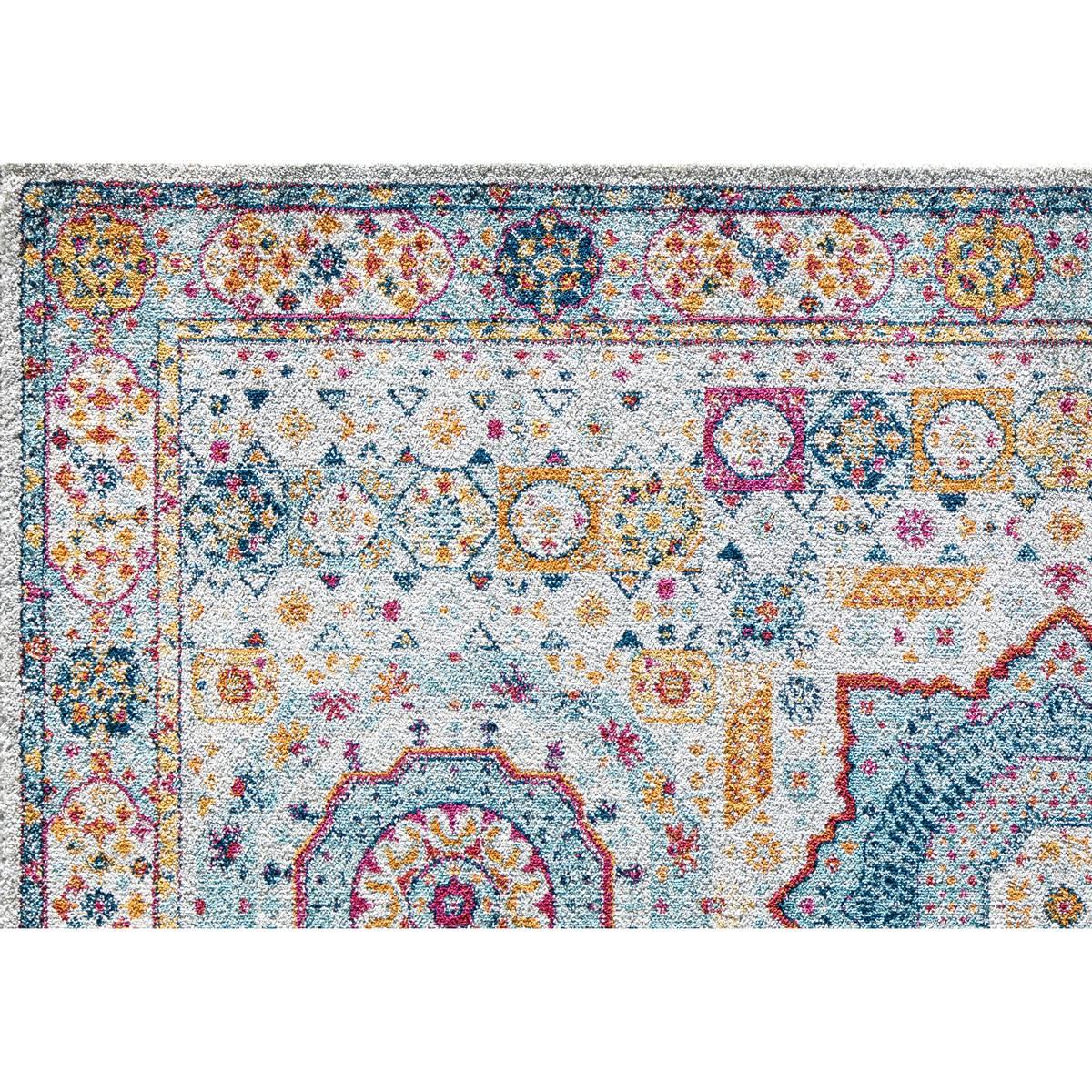 Decorate your home with this mixed retro-modern Rugs America™ Hailey Constellation Abstract Vintage Area Rug. Featuring a playfully colorful palette of gold, magenta, and sky blue, the hues bring out the minute details of the uniquely spirited medallion designs and stunning linework.