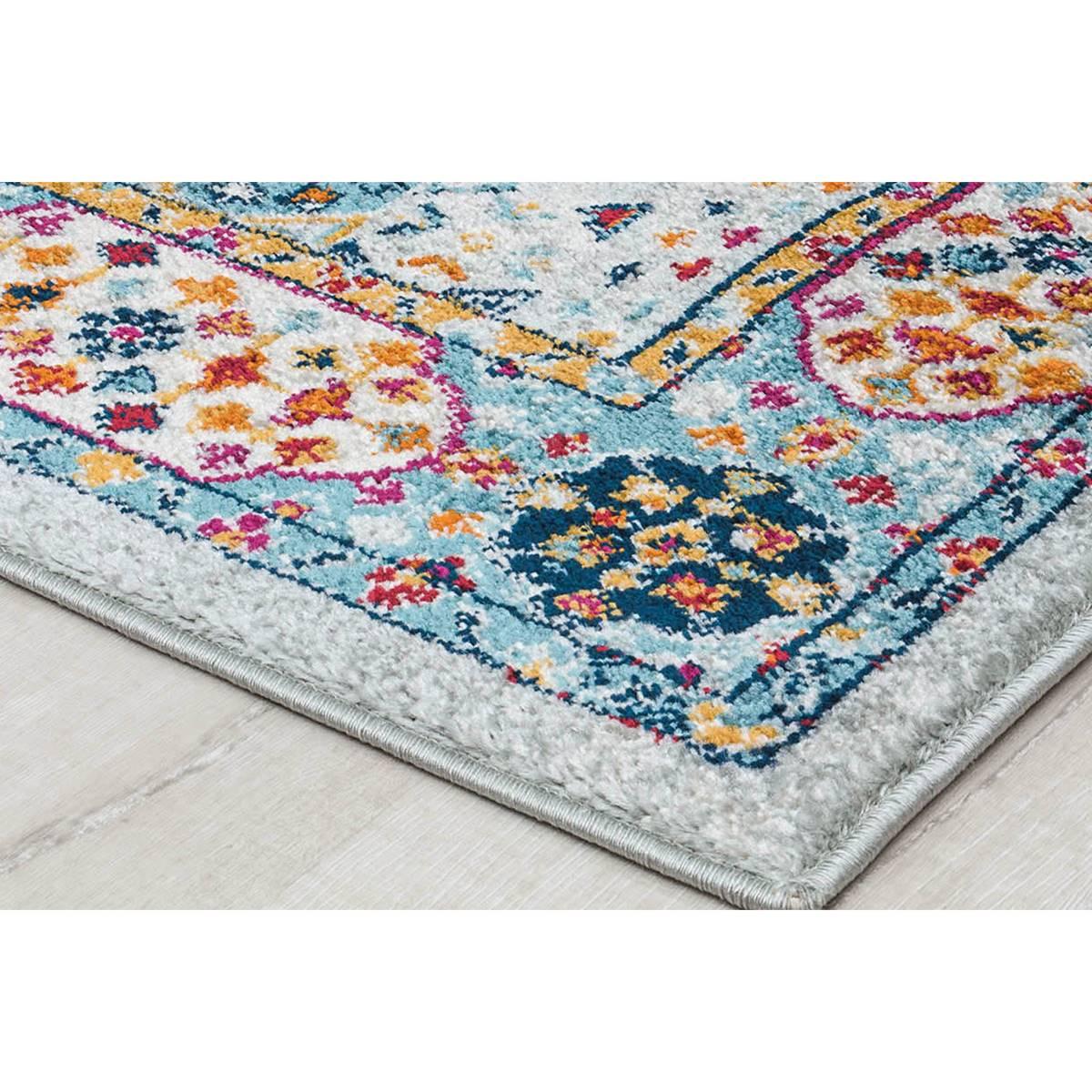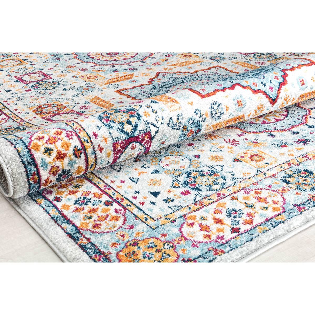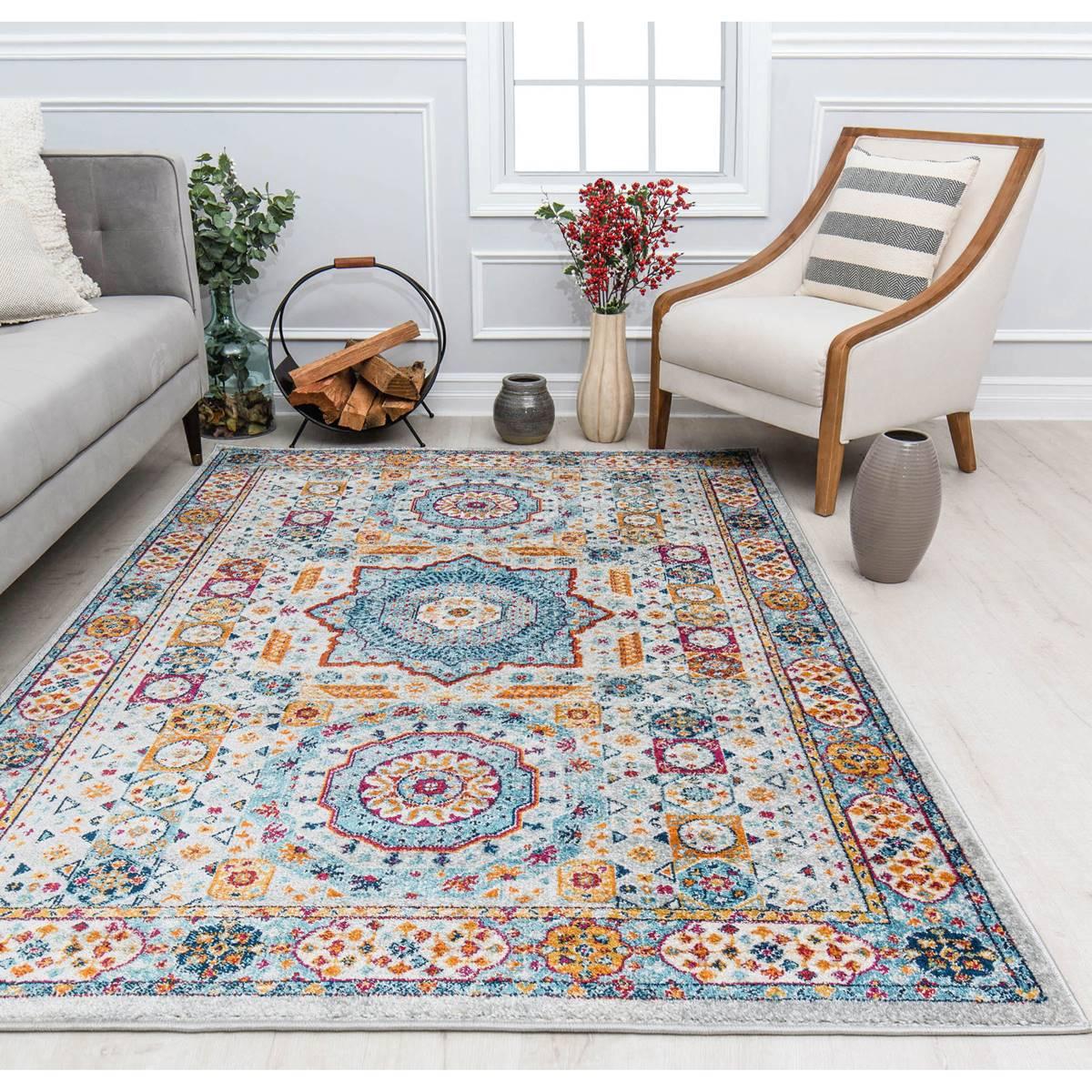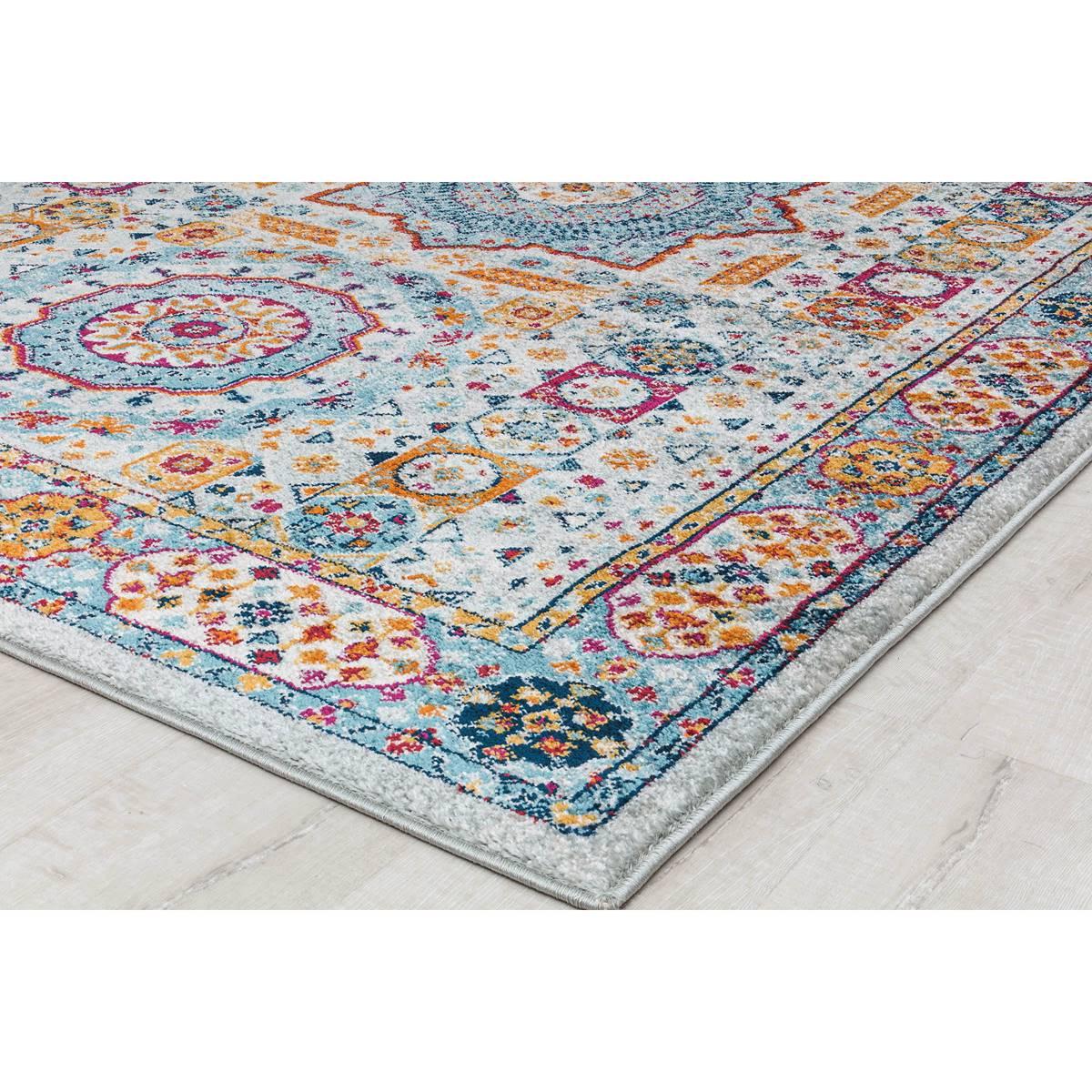 Decorate your home with this mixed retro-modern Rugs America™ Hailey Constellation Abstract Vintage Area Rug. Featuring a playfully colorful palette of gold, magenta, and sky blue, the hues bring out the minute details of the uniquely spirited medallion designs and stunning linework.