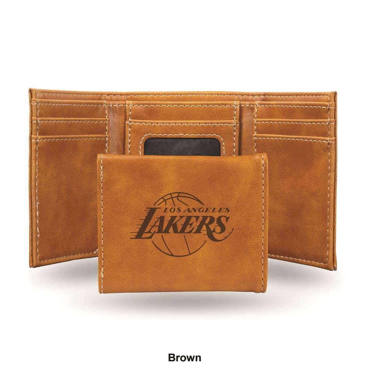 Carry a part of your favorite team with you and simultaneously keep your money safe with this Mens NBA Los Angeles Lakers trifold wallet. Made of faux leather, the 4-inch long and 3.25-inch wide wallet features a Los Angeles Lakers embossed logo, card slots, and an ID window for a complete look.