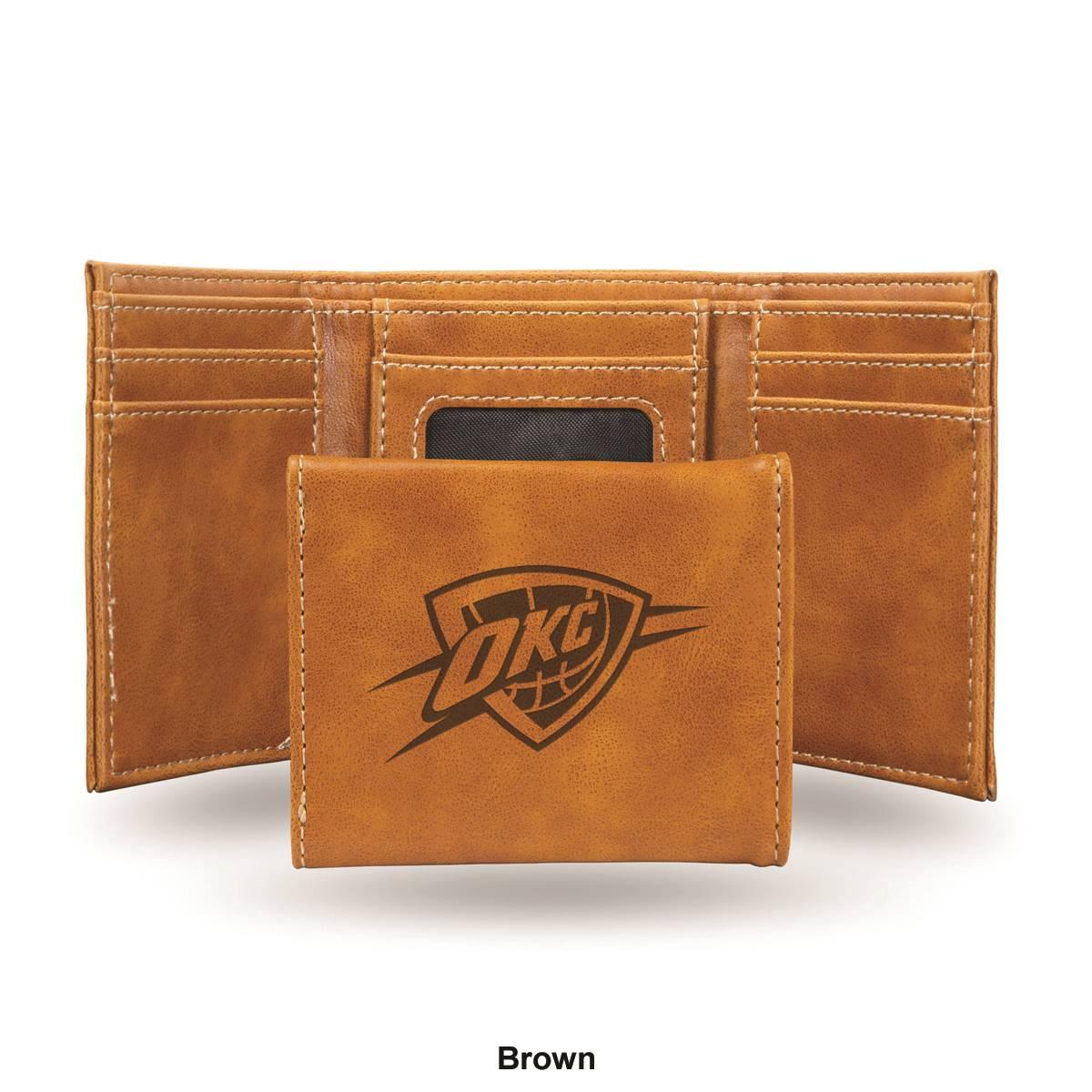 Carry a part of your favorite team with you and simultaneously keep your money safe with this Mens NBA Oklahoma City Thunder trifold wallet. Made of faux leather, the 4-inch long and 3.25-inch wide wallet features an Oklahoma City Thunder embossed logo, card slots, and an ID window for a complete look.