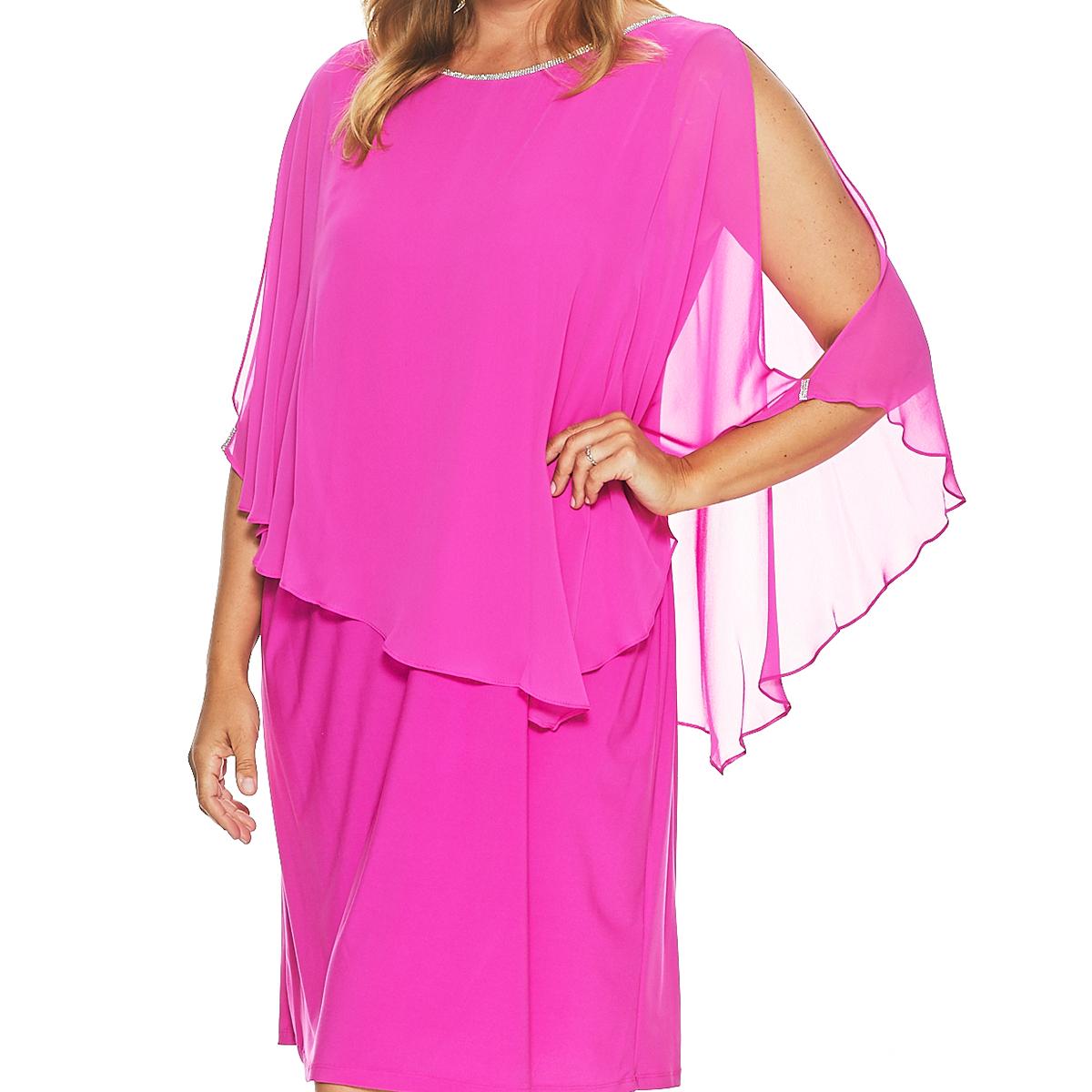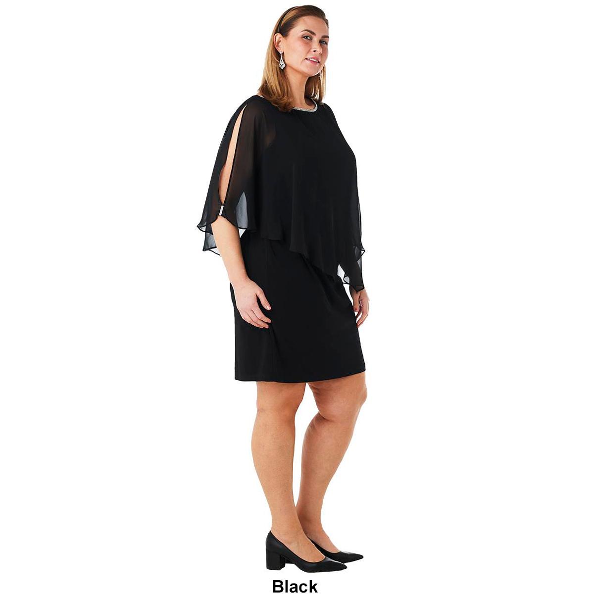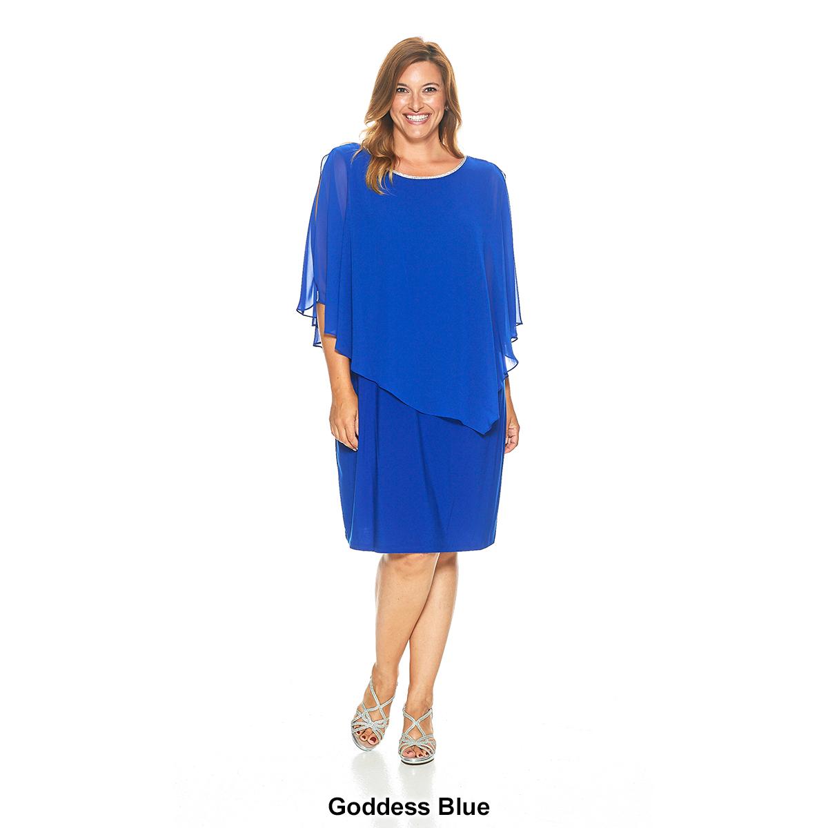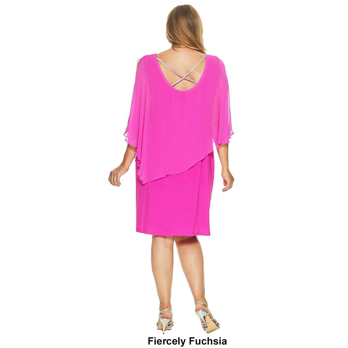 Description This Plus Size MSK chiffon capelet cross back rhinestone stone trim dress is perfect for special occasions. The solid shift dress offers a rhinestone round neckline...