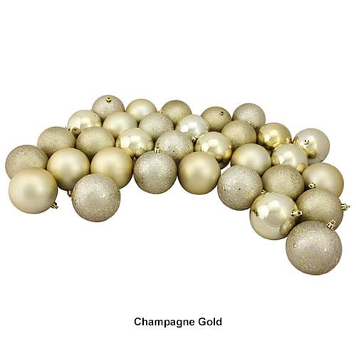 This Northlight Seasonal 32-piece shatterproof 4-finish Christmas ornaments will allow you to build your collection quickly and decorate with more possibilities. These shatterproof ornaments combine the beauty and luster of real glass with the unbreakable practicality of plastic. They are 3.25-inches in diameter and are done in 4 amazing finishes: shiny, matte, glitter drenched and holographic glitter sparkle. They come equipped with gold ornament caps and a pack of matching gold string hangers are included for optional use (ornament hooks not included).