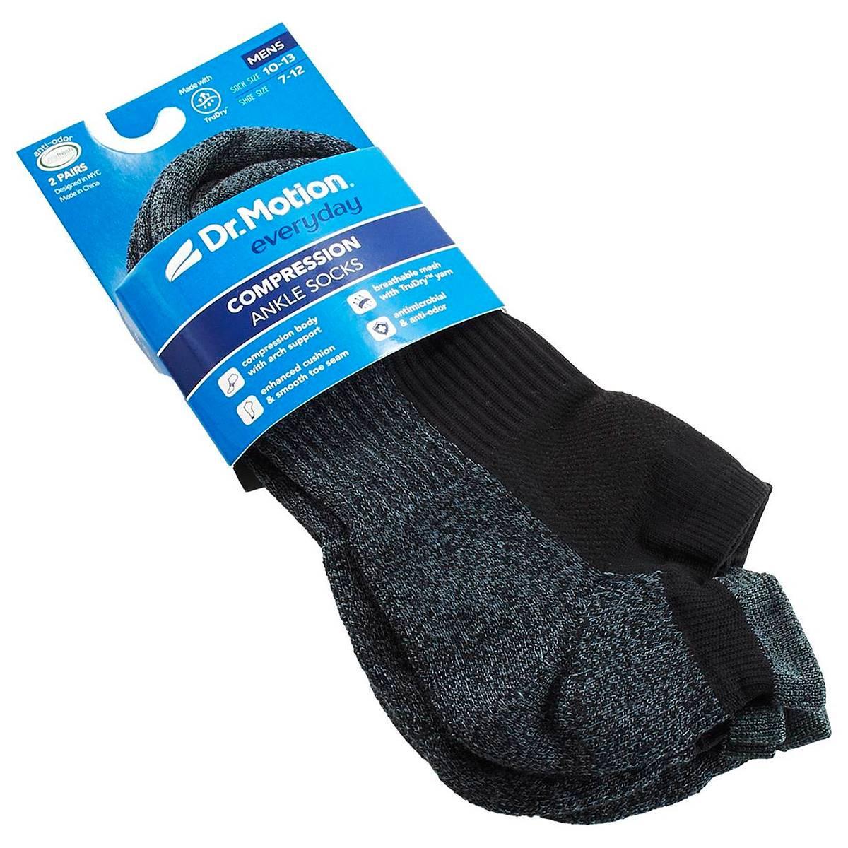 Description Give yourself all day comfort with these Mens Dr. Motion® 2-pack ankle compression socks. These socks feature a compression body with arch support, breathable mesh...