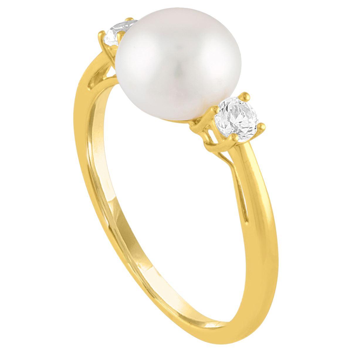 Description In this beautiful Gemstone Classics™ fashion ring, a fresh water pearl is accented by created white sapphire gemstones. This style is set in 10kt. yellow gold....