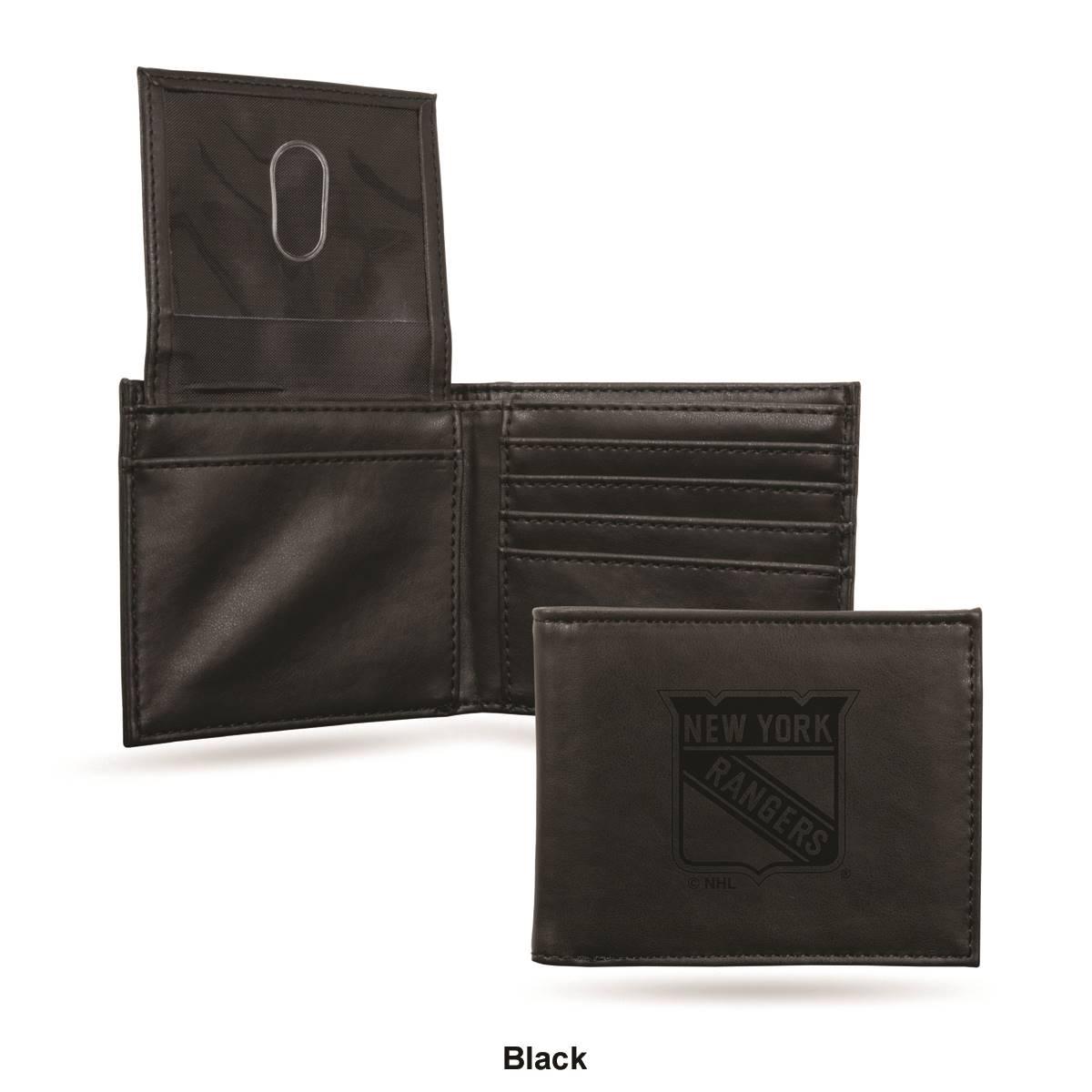 Organize your bills, credit cards, and important business cards in this Mens NHL New York Rangers faux leather wallet. Embossed with a New York Rangers team logo, the bifold wallet comes with multiple card slots and an ID window. Support your favorite NHL team with this 4.25-inch long and 3.5-inch wide wallet.