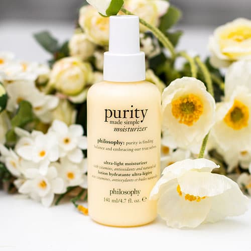 Philosophy Purity Made Simple Moisturizer. At last, you can experience the power of purity moisture, and see healthy, radiant skin instantly! This ultra-lightweight formula leaves skin looking dewy and smooth with less-visible pores—pure and restored to its ideal state. A blend of vitamins C & E, exclusive green tea antioxidant complex, sustainably sourced meadowfoam seed oil and cold-pressed chia seed oil elevates this light-yet-nourishing formula to purity-level perfection.