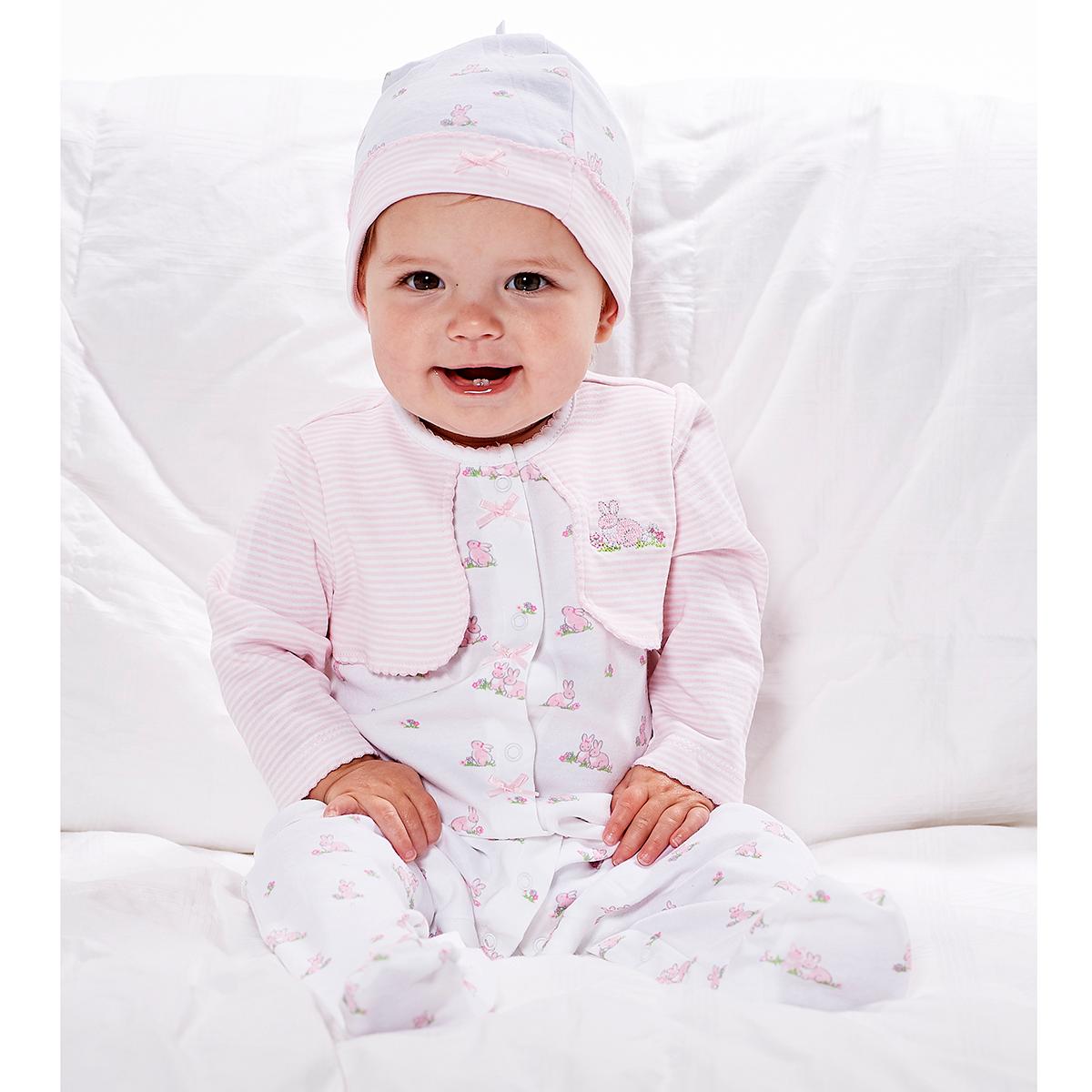 Give her an adorable style with this Baby Girl (NB-9M) Little Me® baby bunnies footie sleeper. The sleeper features a full snap front closure, an attached stripe cardigan, and a bunny print.