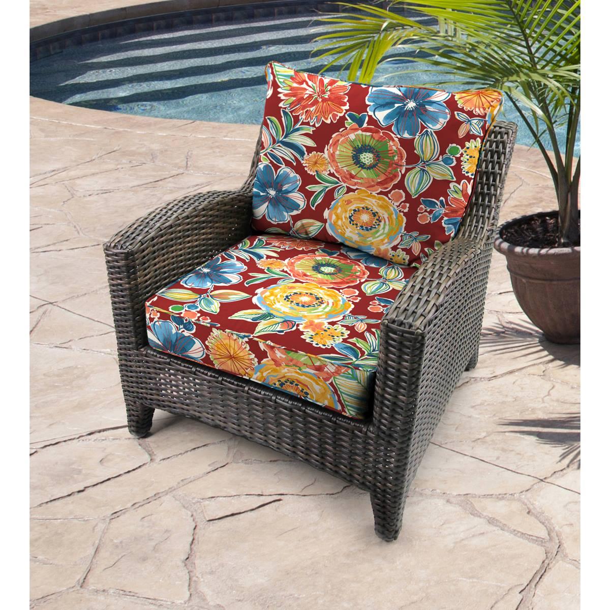 Refresh your outdoor seating arrangement with the comfort and style of this Jordan Manufacturing 2-piece outdoor deep-seat chair cushion set. Covered with a soft fabric and filled with high-density foam and fiber material, the deep-seat chair and back cushion are specially designed to keep you lounging comfortably on your favorite patio chair. Bringing a stylish look to help enhance your patio, deck, or pool area.Recommend bringing inside during inclement weather to prevent cushion damage. Periodic spot cleaning with a mild soap/warm water solution and non-abrasive cloth. Do not use bleach on this item. If item does become wet, stand on side, allow water to run out, and completely air dry before putting away for the season.This item requires oversize delivery. Please refer to the Order Summary in the Shipping step at checkout for delivery charge.