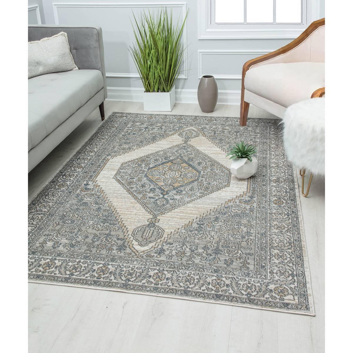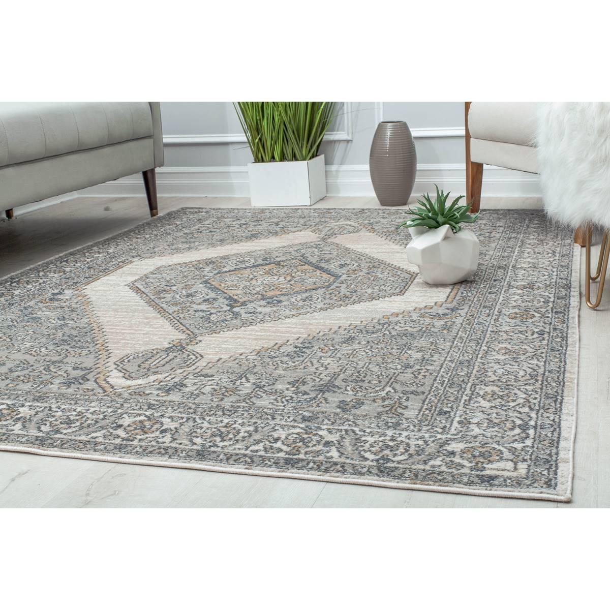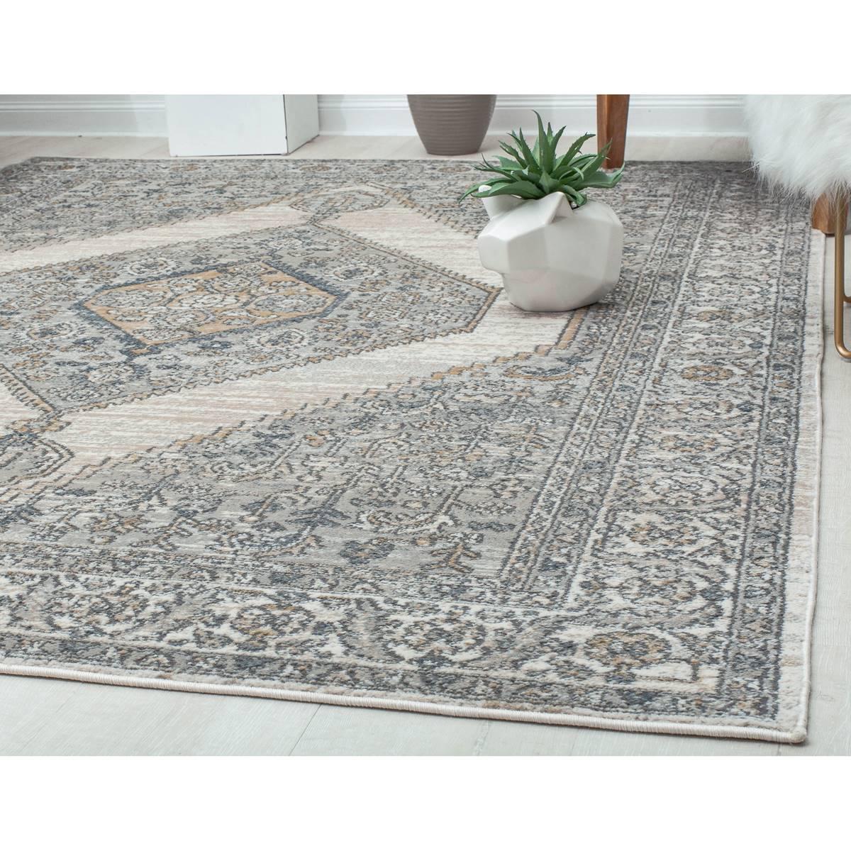 This Rugs America™ Milford Ivory Windsor Transitional Vintage Area Rug finds a playful balance between intricate design and negative space. The center medallion surrounded by creatively placed negative space creates an eye-catching element, unique from your typical traditional heirloom. Made in Turkey.