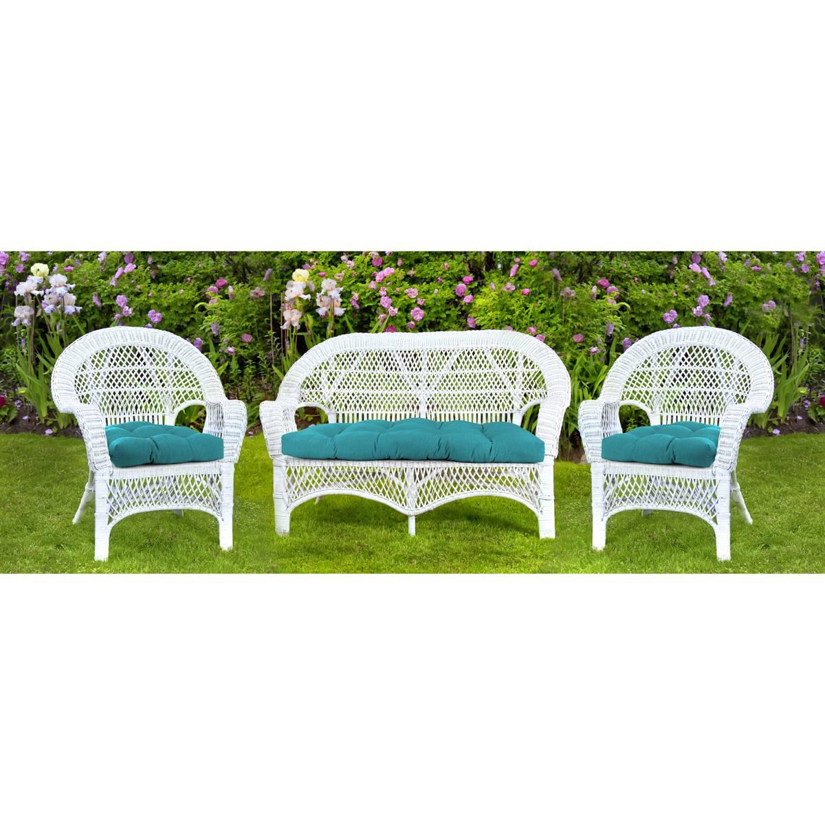 Accentuate your outdoor furniture with this 3-piece Outdoor Wicker Set from Jordan Manufacturing. Each set includes two chair cushions and one settee. All are Knife edge and constructed with spun polyester fabric and blown fiber designed for life outdoors.Recommend bringing inside during inclement weather to prevent cushion damage. Periodic spot cleaning with a mild soap/warm water solution and non-abrasive cloth. Do not use bleach on this item. If item does become wet, stand on side, allow water to run out, and completely air dry before putting away for the season.This item requires oversize delivery. Please refer to the Order Summary in the Shipping step at checkout for delivery charge.