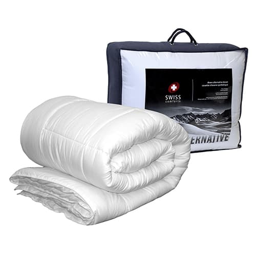 This Swiss Comforts all season brushed soft down alternative duvet is made from the finest hypoallergenic materials, designed to give any room a greater sense of luxurious style and fashion. It is filled with hollow siliconized fiber that provides added softness and comfort, has box quilt stitch design that keeps the filling in place for even distribution and double piping all around for added durability. 100% Microfiber. Machine wash in warm water on gentle cycle. Tumble dry on low setting.