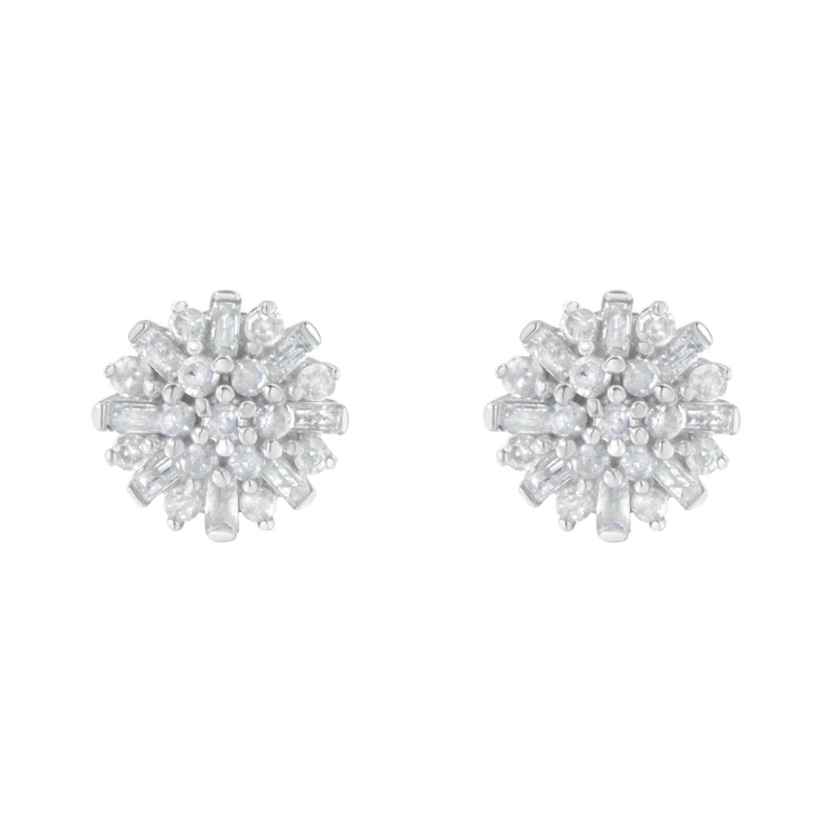 Description These Diamond Classics™ 1/2ctw. Diamond Sunburst Stud Earrings are enchanting and complete any outfit. They are made with 30 round-cut and 16 baguette-cut diamonds...