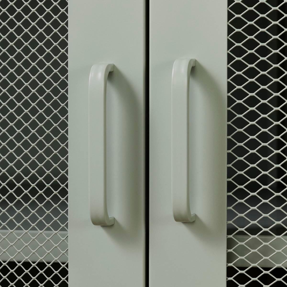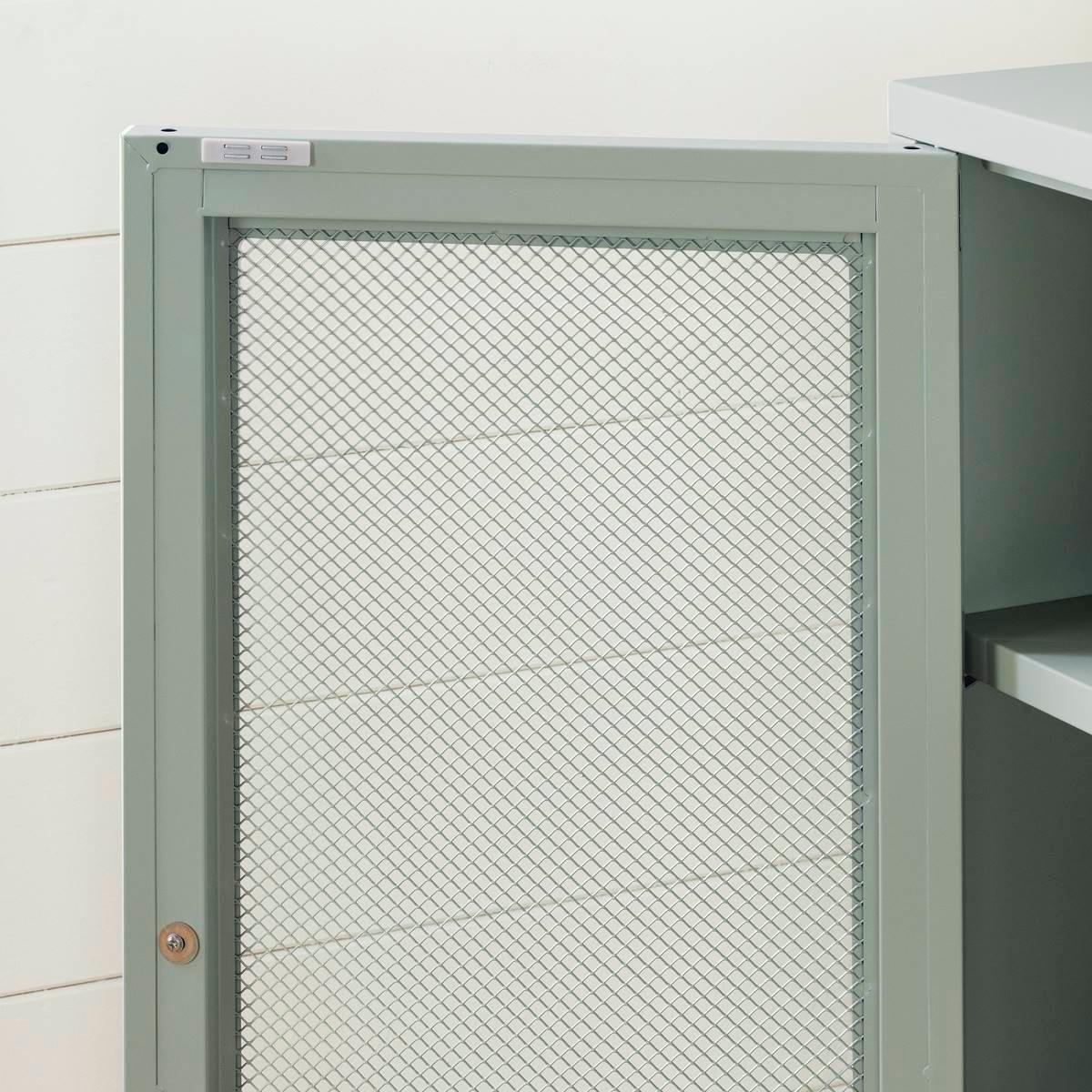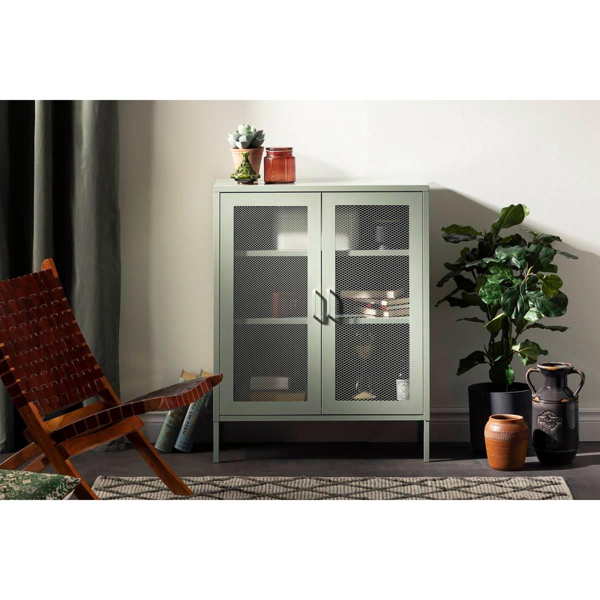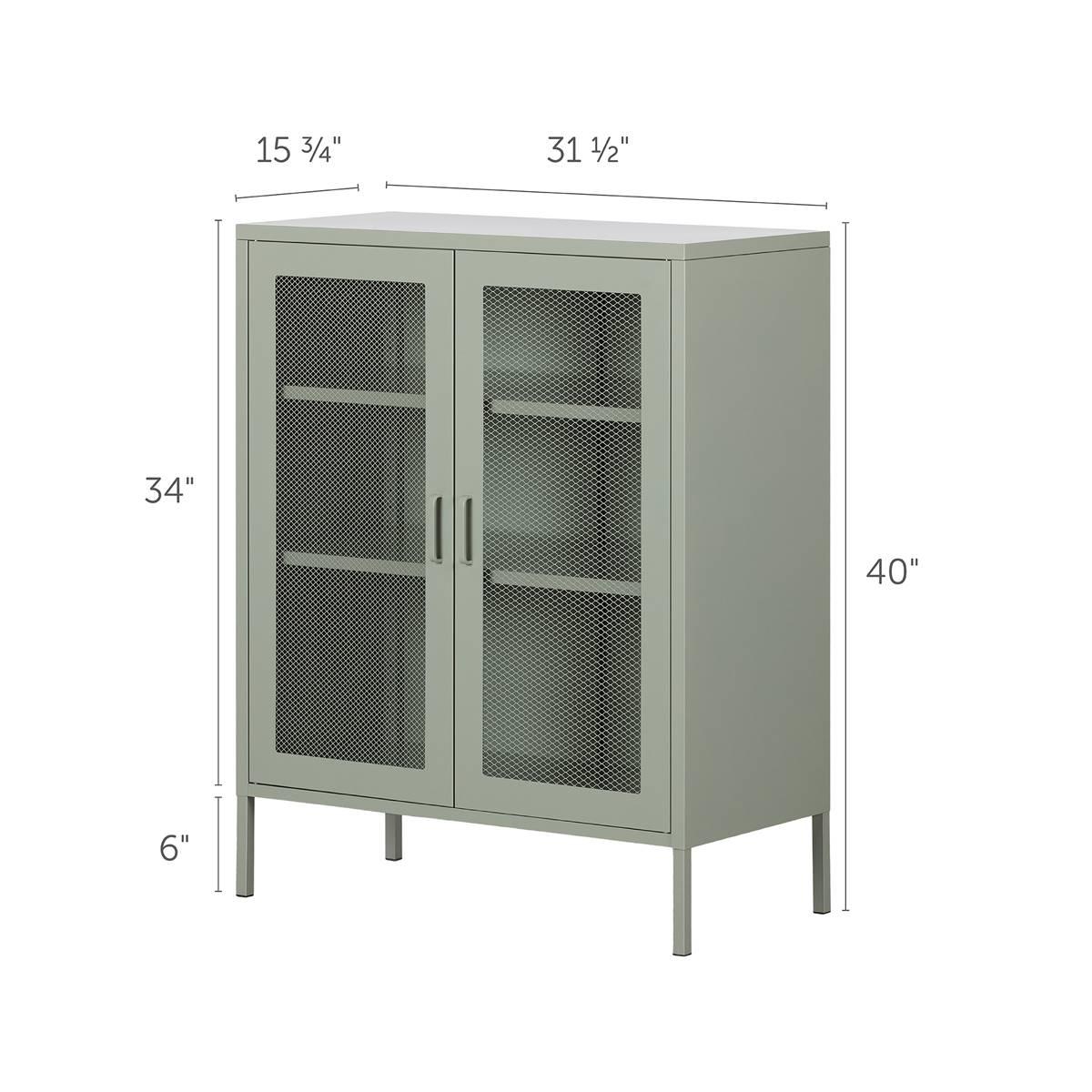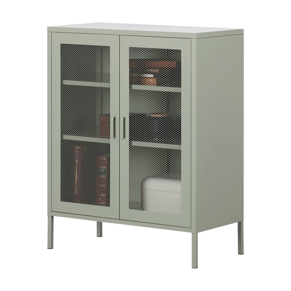 Description This South Shore Crea Sage Green Metal Mesh 2-Door Accent Cabinet has it all! Its two adjustable shelves and one fixed shelf will hold your DIY tools, children´s...