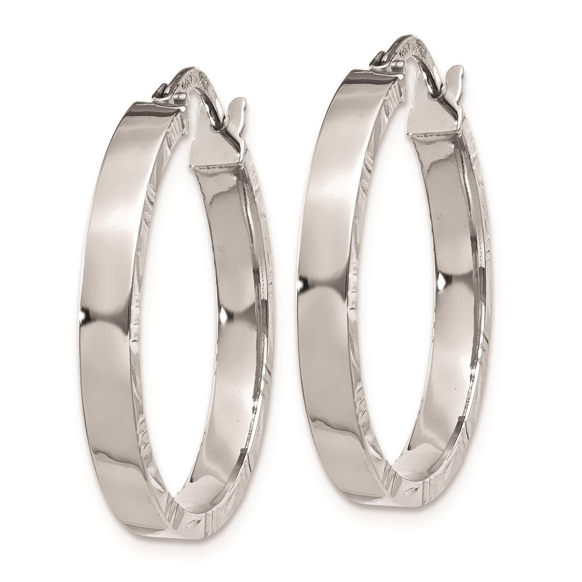 Embellish your ears with these ravishing Gold Classics™ 14kt. white gold hoop earrings. These 26.75x25mm earrings showcases diamond-cut detailed edge with brilliant polished finish for wonderful look. Secured with wire and clutch clasp, these lightweight earrings are sure to catch attention.