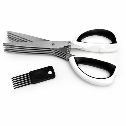 This BergHOFF Essentials multi-blade herb scissors features five stainless steel blades that help to simplify chopping and to keep delicate herbs intact. The multi-blades allow for fine, medium or large cutting sizes. Included is a cleaning brush.