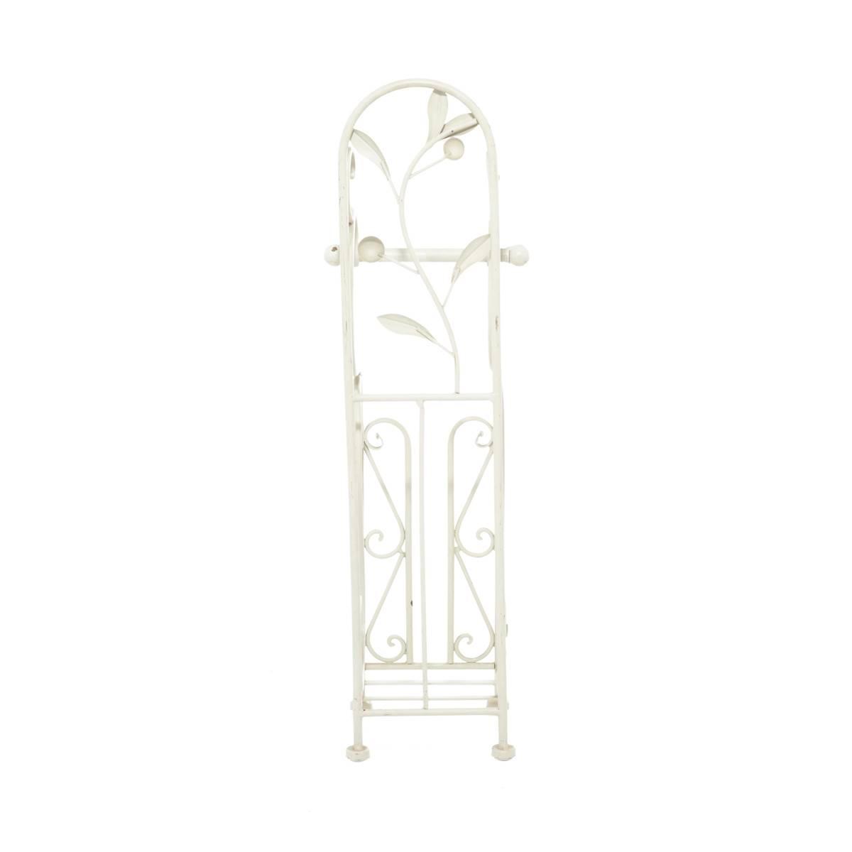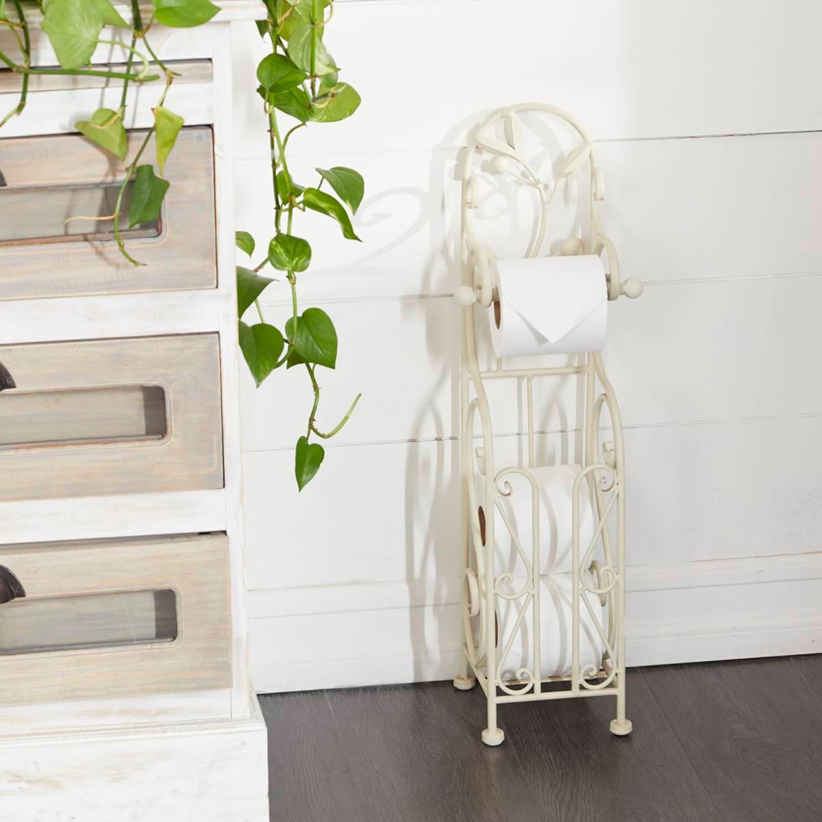 Decorative and functional, this 9th & Pike® metal toilet paper holder is a smart addition to any traditional-style bathroom. The holder is made from solid iron, and it uses curved lines and plant designs to achieve an elegant look. A cream finish allows it match a variety of color palettes. Add a new roll of toilet paper to the top holder, and use the bottom compartment to secure two additional rolls.