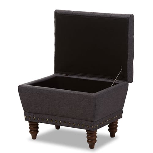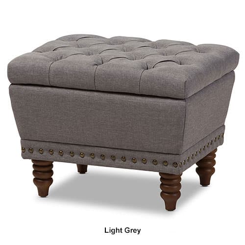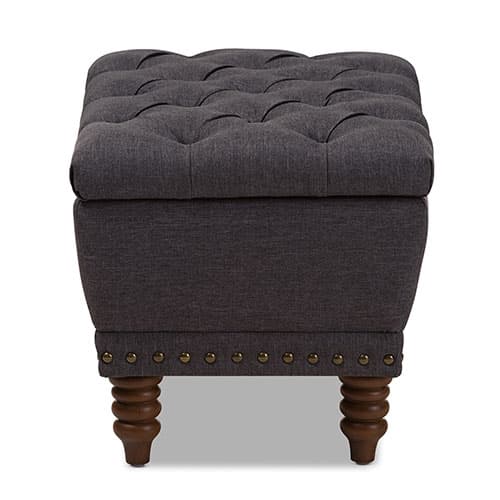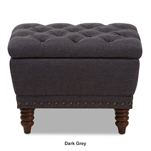 The Baxton Studio Annabelle upholstered button tufted storage ottoman features a pure polyester fabric that provides exceptional softness and durability. It features solid wood legs in a walnut finish, a cushioned seat with a button-tufting design, and large bronze finished nail heads that trim around the bottom of the stool. This Annabelle ottoman is ideal as an added seating space while enhancing interest in your existing décor. Extra storage space within the ottoman gives you with additional option to hide away the clutter. Made with 100% dacron, wood eucalyptus, and foam. Spot clean only. Dimensions: 16.14”H x 22.05”W x 16.93”D.