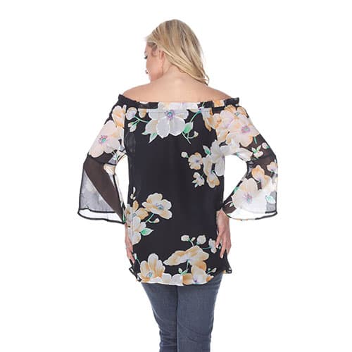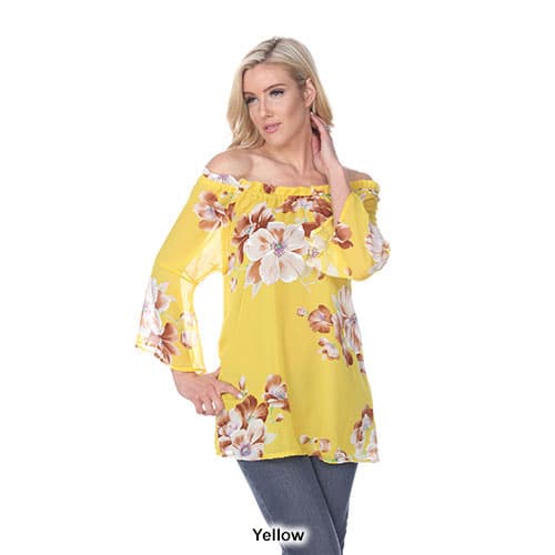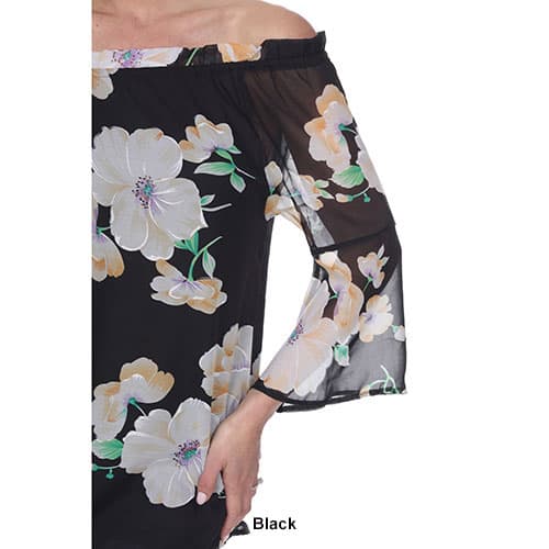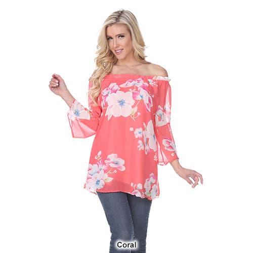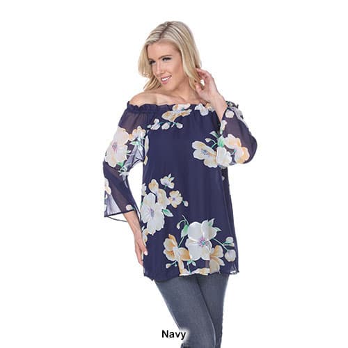 This Womens White Mark Keola tunic lets your shoe off your sun kissed shoulders! Its breezy design showcases flowers that float dreamily atop of this beautifully draped, 3/4 length bell sleeve shoulder baring blouse.