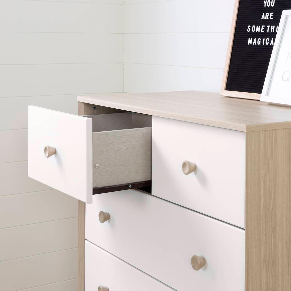 The South Shore Yodi chest showcases a Scandinavian inspired look, contrasting facade, and wood style finish that will delight anyone who loves minimalist design. Its angled legs and cone shaped wooden handles add a touch of warmth. This chest gives you lots of storage. The three lower drawers are roomy enough to hold all your clothes as well as bedding, while the two top drawers – side by side – are perfect for accessories, socks, and underwear. Every drawer is mounted on metal slides, ensuring a smooth back and forth movement.