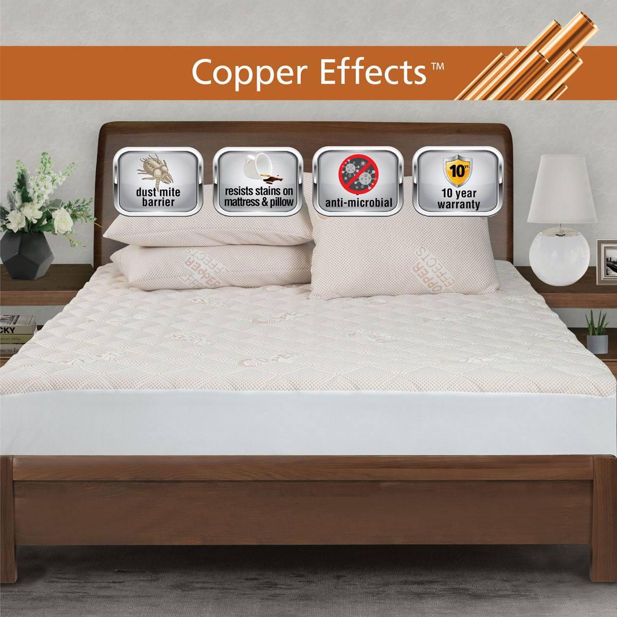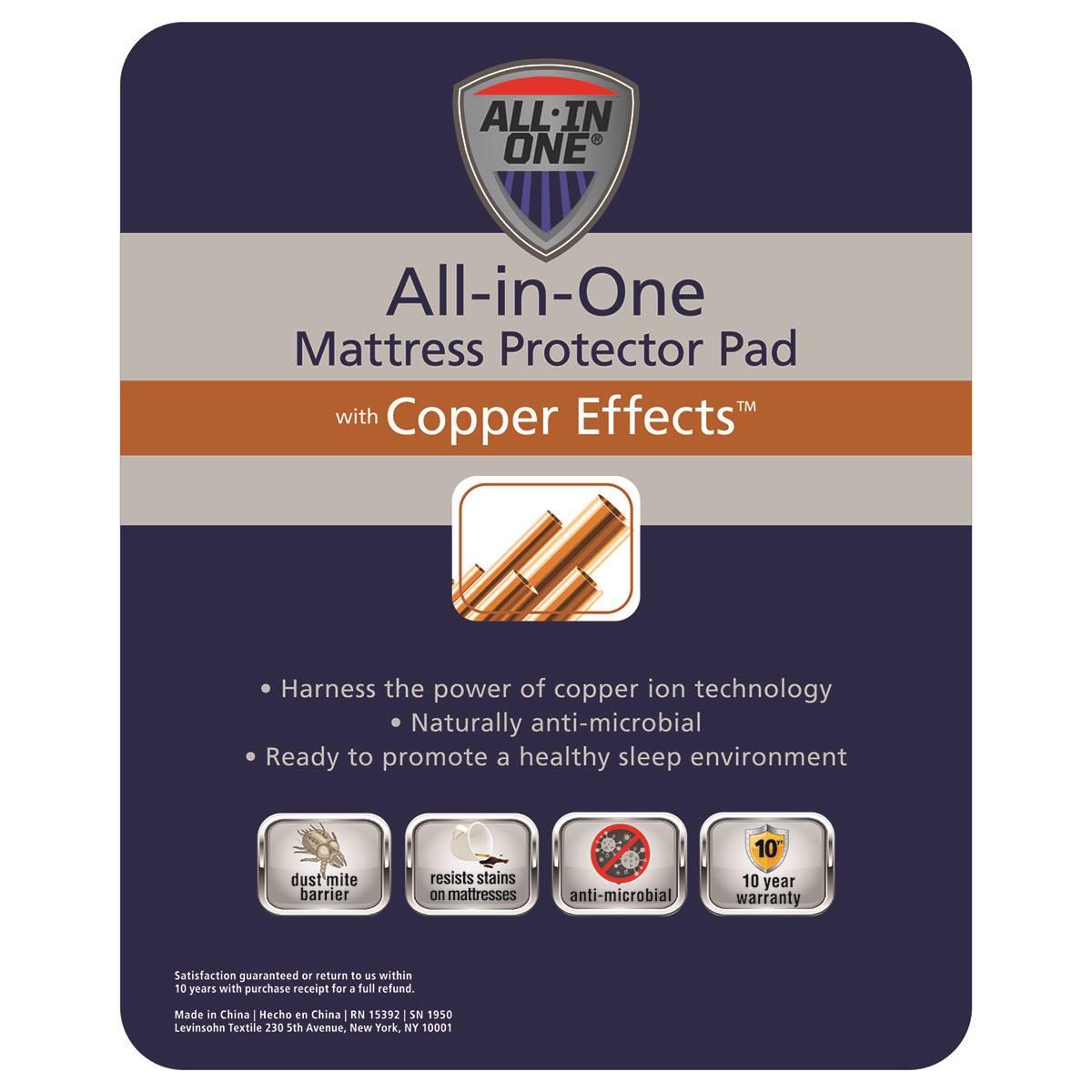 All-In-One provides maximum protection for your mattress and pillows against dust mites, pet dander, and other unwanted allergens. It uses strong, safe, and soft fabric, without sacrificing breathability and comfort. The All-In-One Copper Effects™ Collection features naturally antimicrobial copper. All-In-One Copper Effects™ specially woven fabric harnesses the power of copper to keep you and your family sleeping clean and safe. All products are water-resistant, stain-resistant, and hypoallergenic to keep your family sleeping safe. Fitted mattress pads feature stretch sidewalls fitting mattresses up to 15 inches deep.
