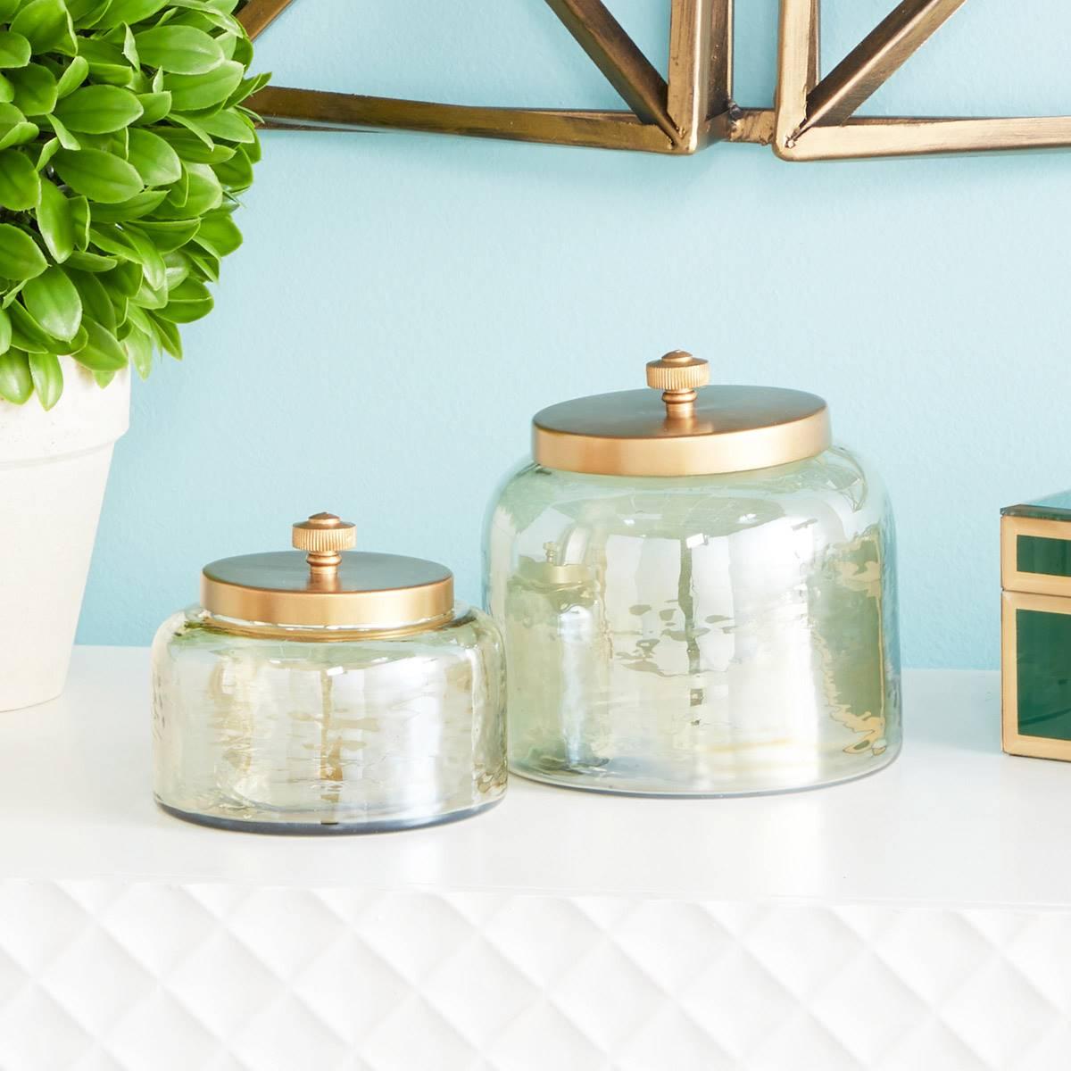 Description This 9th & Pike® pair of smoked glass jars is pretty magical. The translucent gold hue has an enchanting iridescence from the smoked glass finish, whereby when...