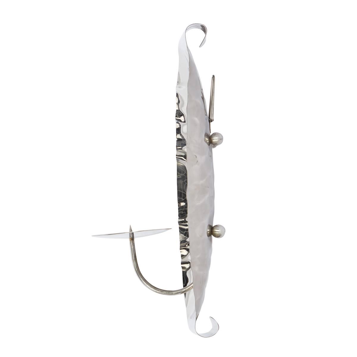 Witness the charm under modern lighting with this 9th & Pike® stainless steel Indian-made wall-hanging candle holder set. Both pieces carry a silvery finish and a platform with a spike that holds votive or tapered candles, making them suitable fixtures in eclectic interiors. They hang via triangle backings.