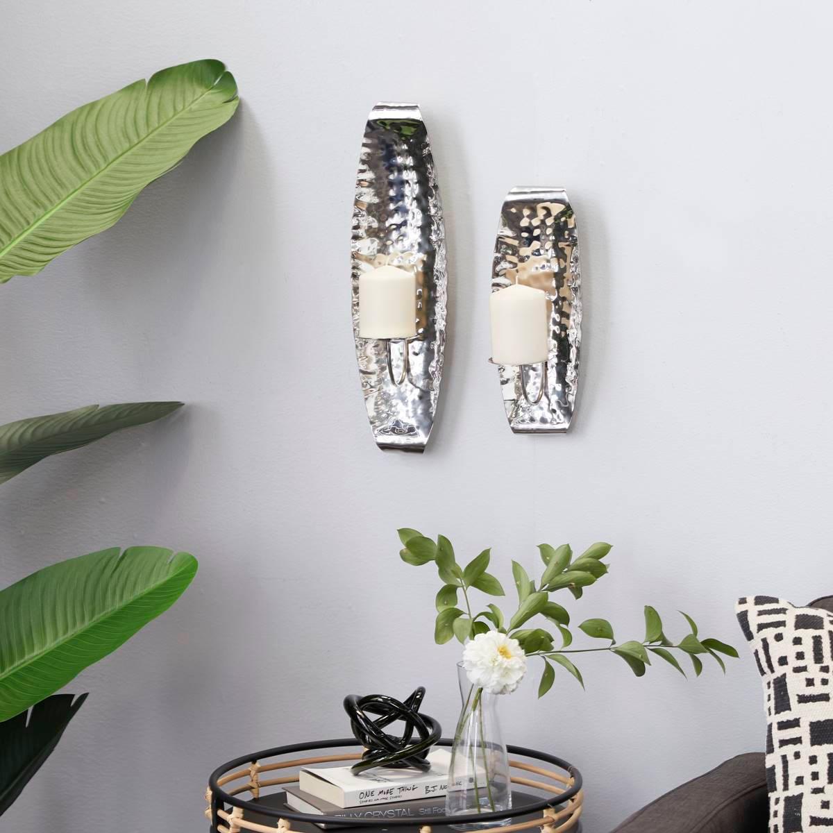 Description Witness the charm under modern lighting with this 9th & Pike® stainless steel Indian-made wall-hanging candle holder set. Both pieces carry a silvery finish and a...