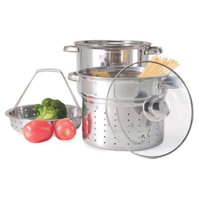 Healthy Living by Select Home stockpot/steamer 4 piece set features a polished stainless steel exterior, see-through glass lid, and riveted stainless steel handles. Includes a 12-quart stockpot, glass lid, pasta basket, and steamer insert.