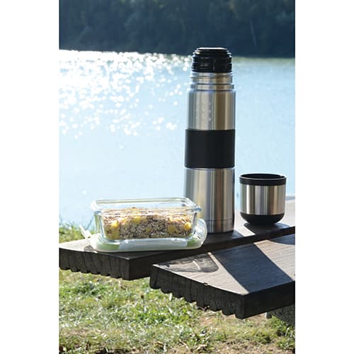 This BergHOFF Essentials Orion travel thermos is made with a durable stainless steel. The inside is double walled with rubber accents that make it lock better, and reduces leaking. The bottom features an anti-skid layer that helps to cup to avoid falling over.Limited Manufacturer´s Warranty