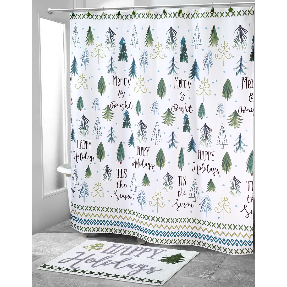 The Avanti Christmas Trees shower curtain is printed with a "Happy Holidays", "Tis the Season" and "Merry and Bright", surrounded by a series of whimsical Christmas trees in blues, greys, and greens on an off-white ground. The bottom is bordered with rows of "X´s" and zig-zags and the top is finished with a row of "X´s".