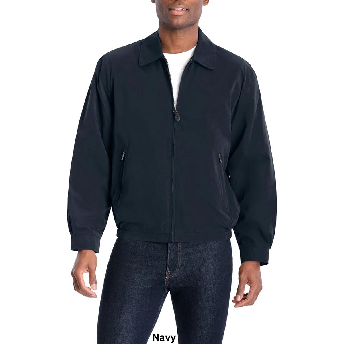 This Mens big & takk London Fog solid golf jacket features lightweight soft touch material, zip closure, an adjustable cuff, 2 zip front pockets, a semi-elastic waist, a comfortable mesh lining, and multiple interior pockets. Shell: 92% Polyester, 8% Nylon. Lining: 100% Polyester. Machine wash. Tumble dry.
