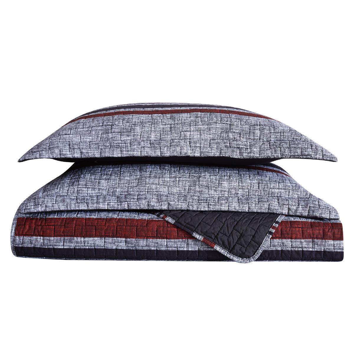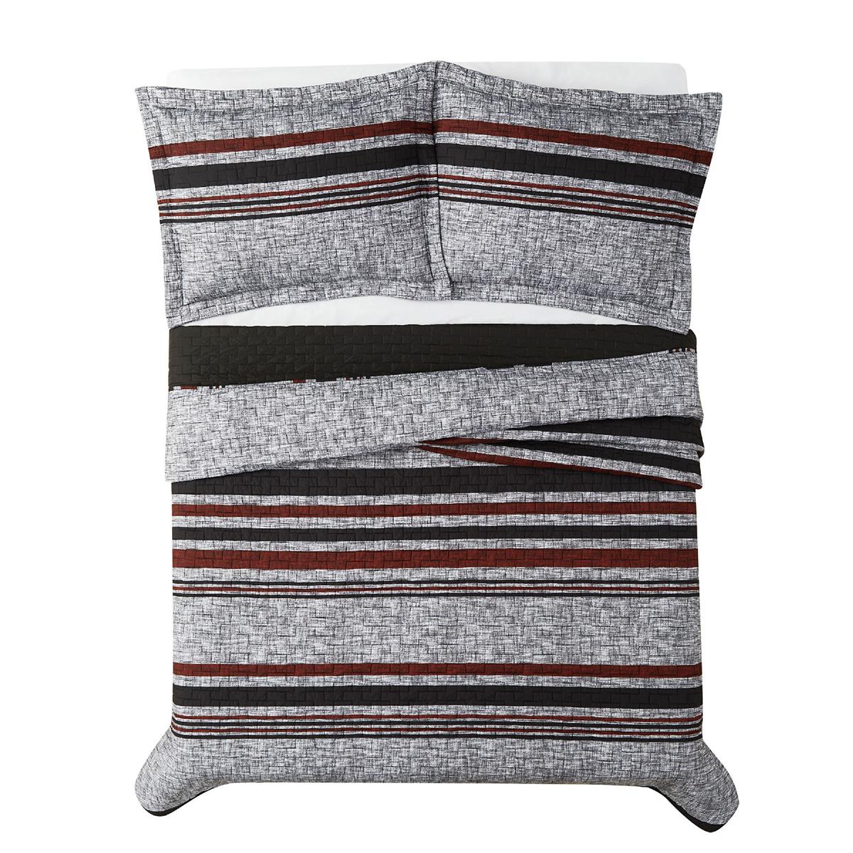 Description This London Fog Warren quilt set features a linen-textured stripe in deep charcoal shades combined with black and deep red making a dramatic statement in any bedroom....