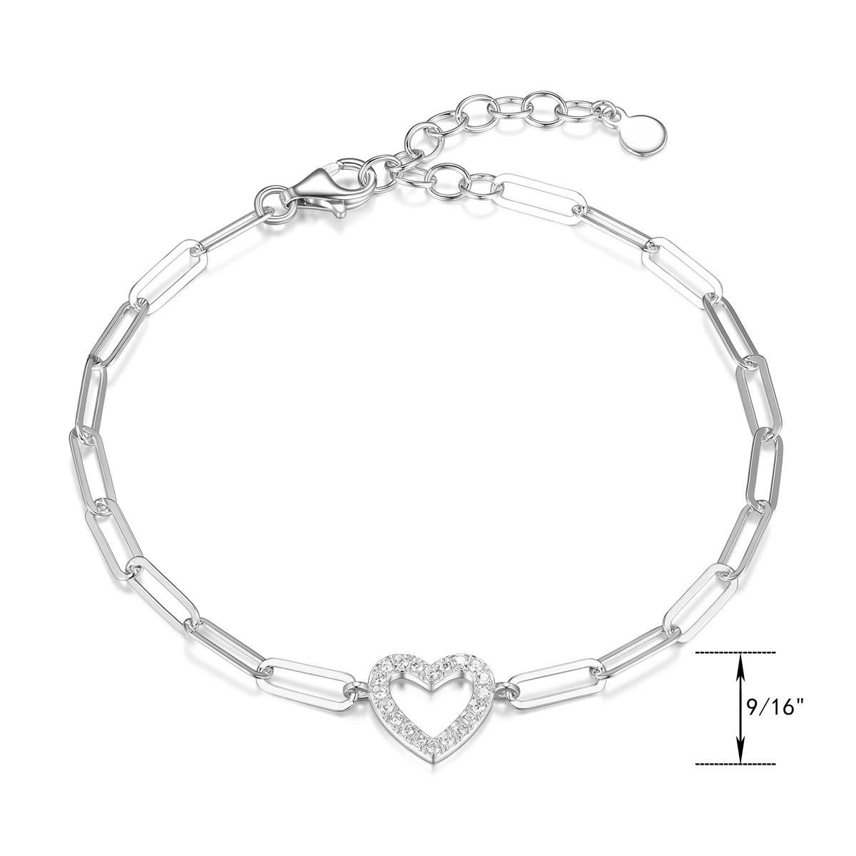 This Forever Facets open heart paperclip chain bracelet is handcrafted in sterling silver, nickel-free, and hypoallergenic. A simple stylish bracelet set with sparkling cubic zirconia. The bracelet measures 6.75-inches with a 1.25-inch extension paperclip chain, showcasing a cubic zirconia open heart center. This stunning paperclip bracelet makes a meaningful, loving gift idea for birthdays, holidays, Mother´s Day, Valentine´s Day, bridesmaids, or any special occasion.